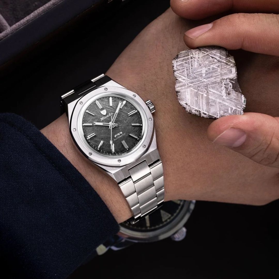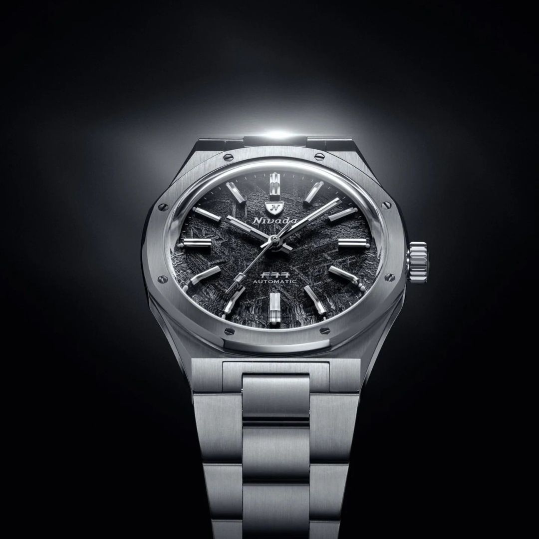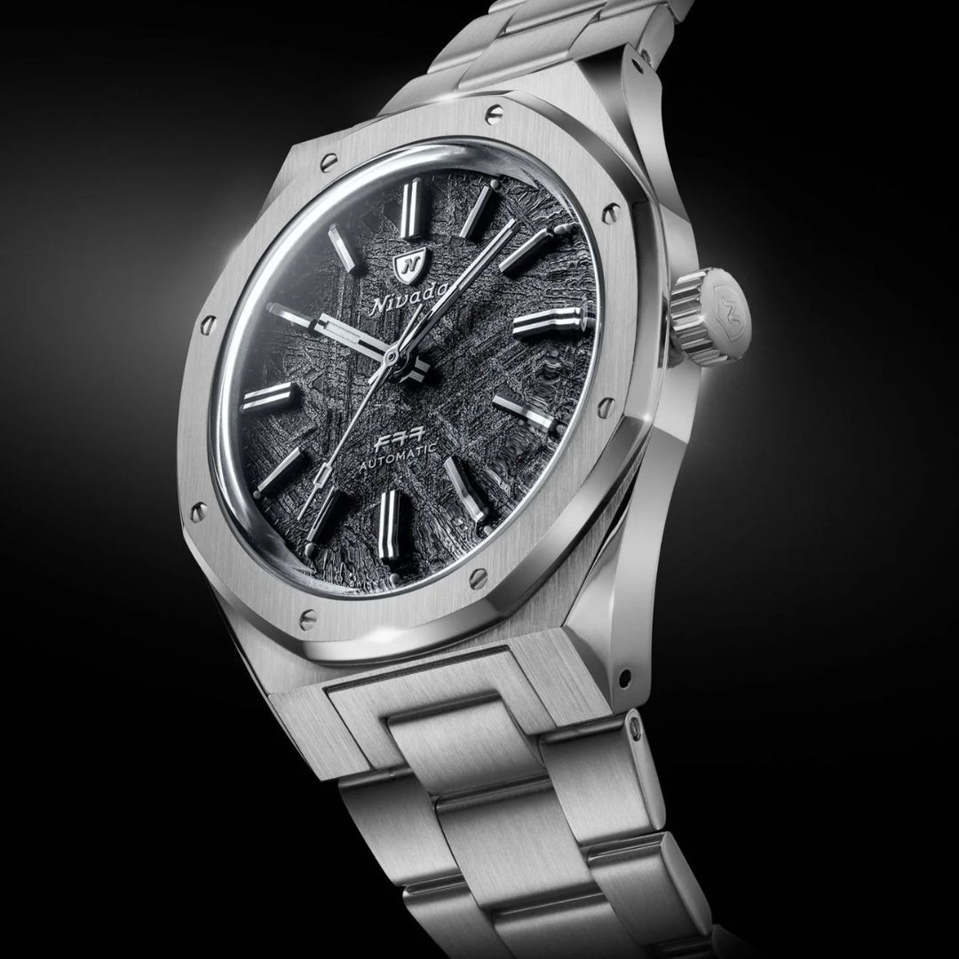 The F77 Meteorite 41mm redefines what it means to wear a piece of history. Crafted in 316L stainless steel with alternating brushed and polished finishes, it houses a genuine meteorite dial, each with a unique crystalline pattern formed over millions of years in space. This Big Size edition introduces a larger 41mm case, giving the F77 even greater wrist presence while retaining the elegance and proportions that made it a 1970s icon. The integrated steel bracelet has been completely re-engineered for comfort and flow, hugging the wrist with precision. Powered by the Swiss SOPROD P024 automatic movement, protected by a double-domed sapphire crystal and 100m water resistance, the F77 Meteorite 41mm merges celestial beauty with Swiss watchmaking mastery. A true statement piece, timeless, rare, and cosmic.
