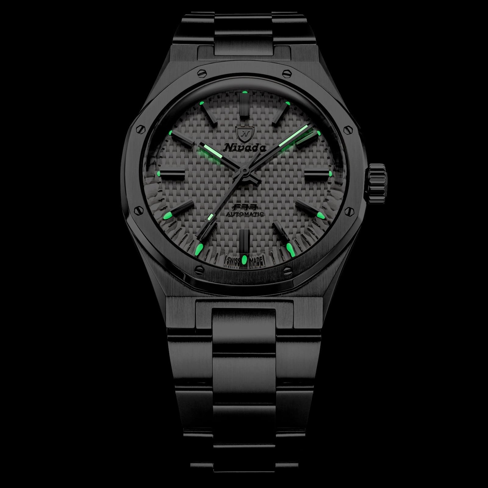 The F77 MKII White Tressed Dial offers contrast and clarity within the iconic integrated case design. Its embossed texture creates shadow play across the surface, while luminous markers ensure readability. The MKII refinement enhances wearability while maintaining the recognizable octagonal bezel and integrated bracelet. Swiss automatic precision completes the package. Minimal. Architectural. Modern.