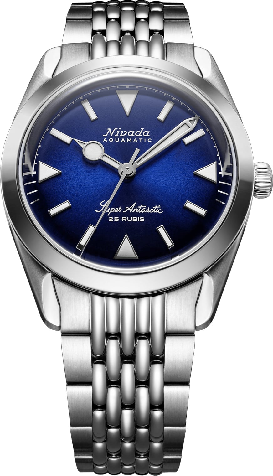 A classic explorer silhouette, reimagined in a brand-new colorway: Super Antarctic Blue marks the first blue dial in Antarctic Collection lineup. The dial is finished in a crisp sunray-brushed blue, paired with applied silver indexes and BGW9 lume for clean, high-contrast readability.