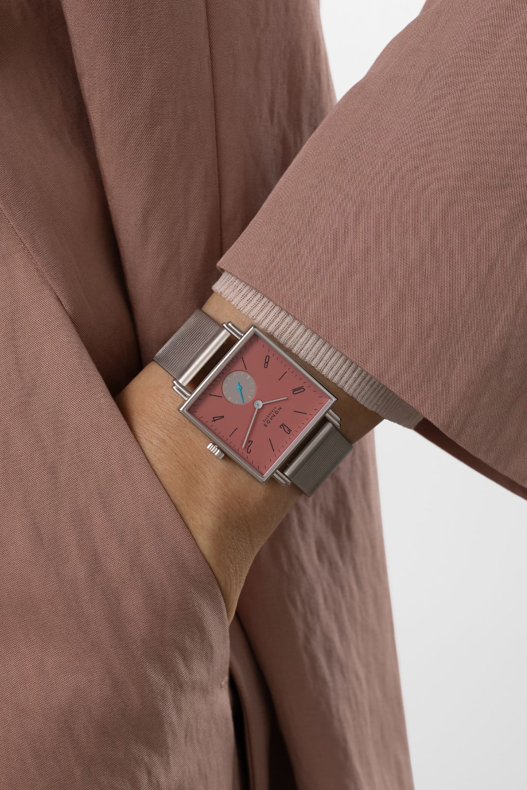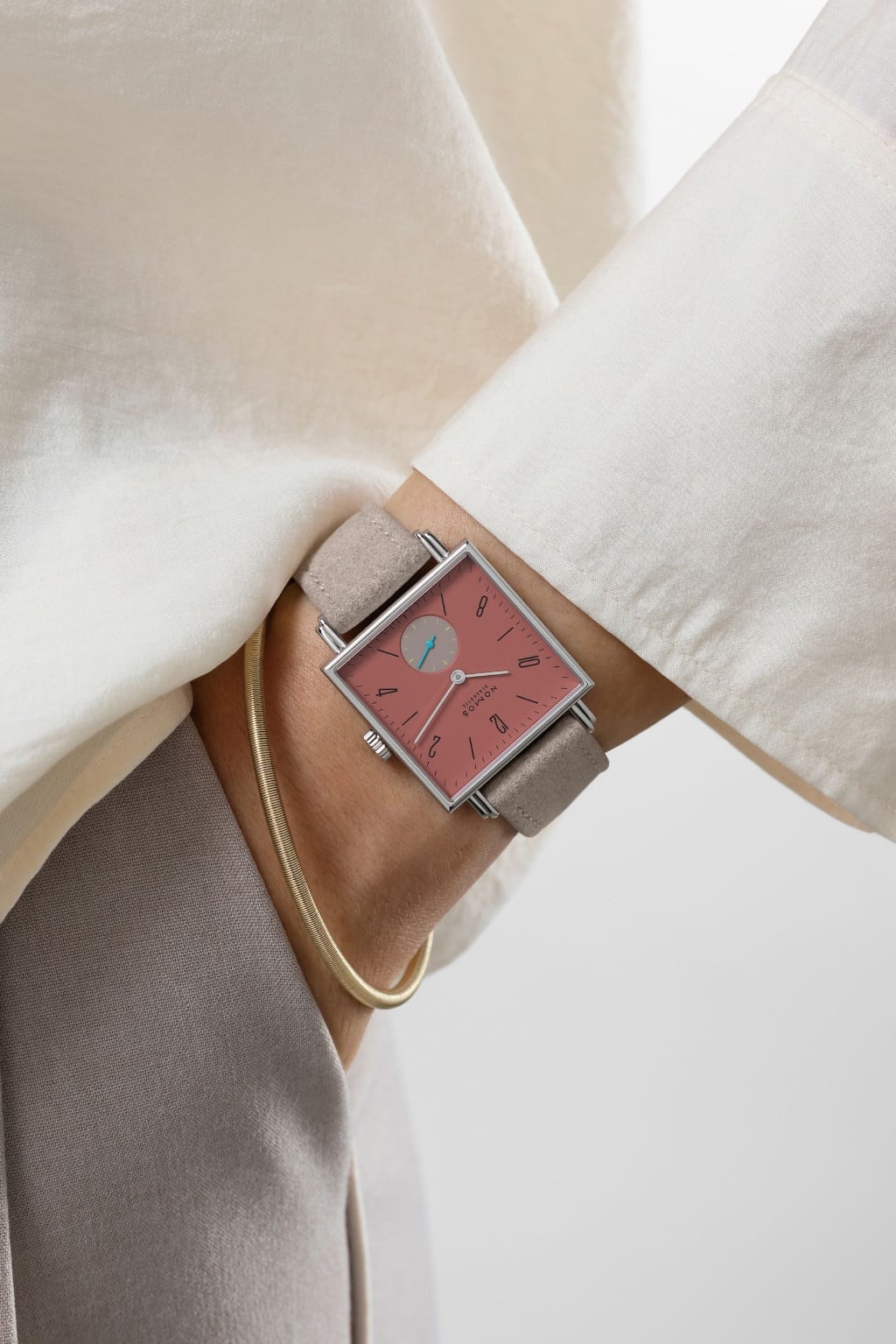 This warming shade of terracotta red is surprisingly versatile, pairing effortlessly with a wide range of jewel tones. The rhodium-plated hands and stainless steel case also make this watch the perfect companion for silver jewelry.