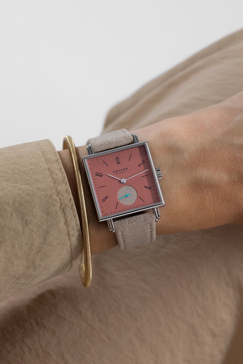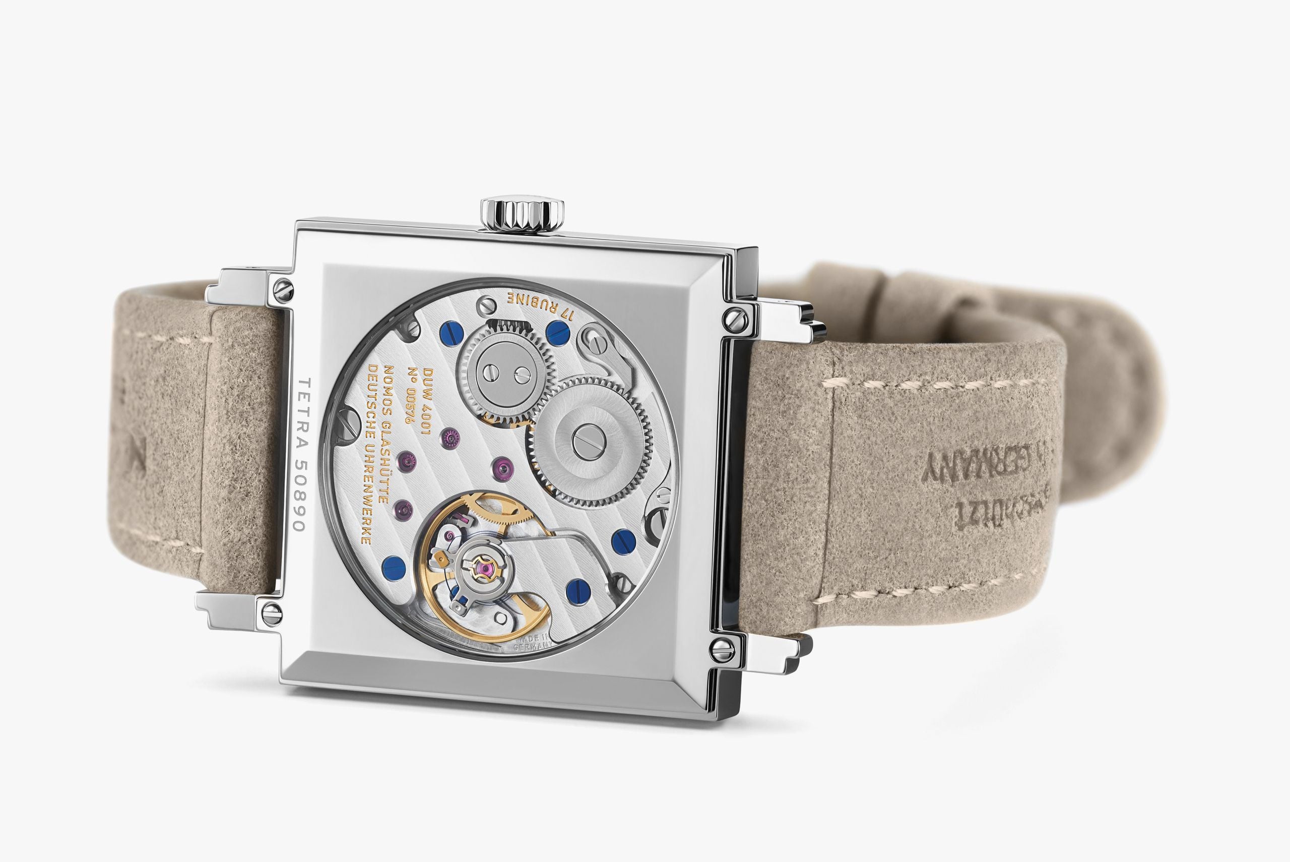 The Tetra model is known for its distinctive square case, with double lugs adding a decorative touch.
