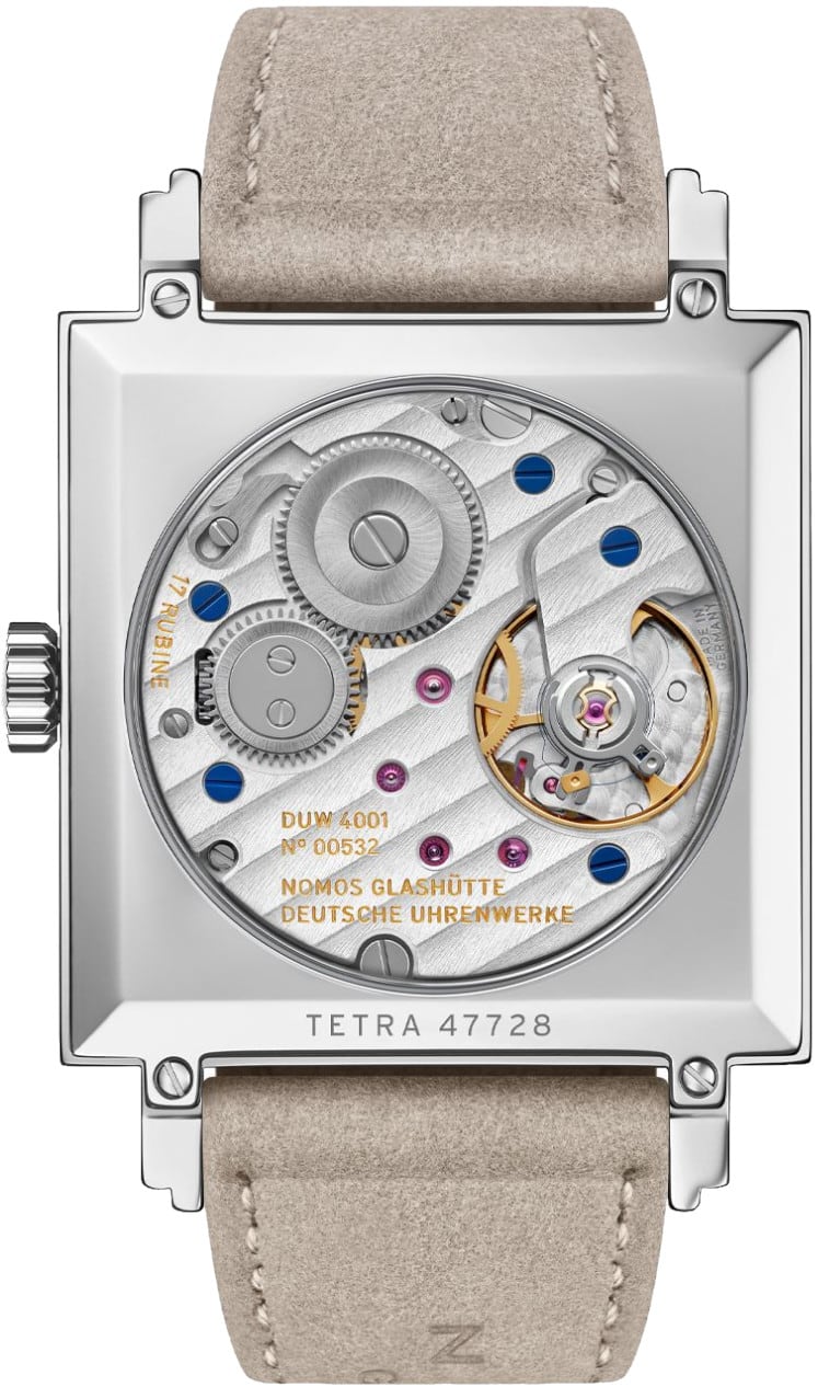 The Tetra model is known for its distinctive square case, with double lugs adding a decorative touch.