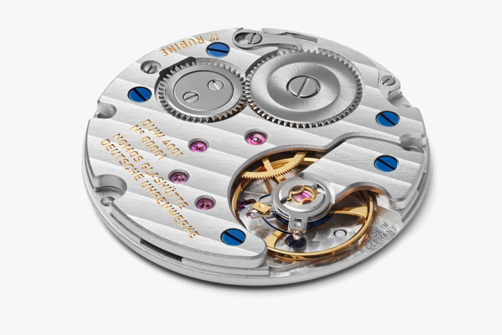At work within: the manual DUW 4001 caliber from NOMOS Glashütte, which features the NOMOS swing system—our proprietary escapement.