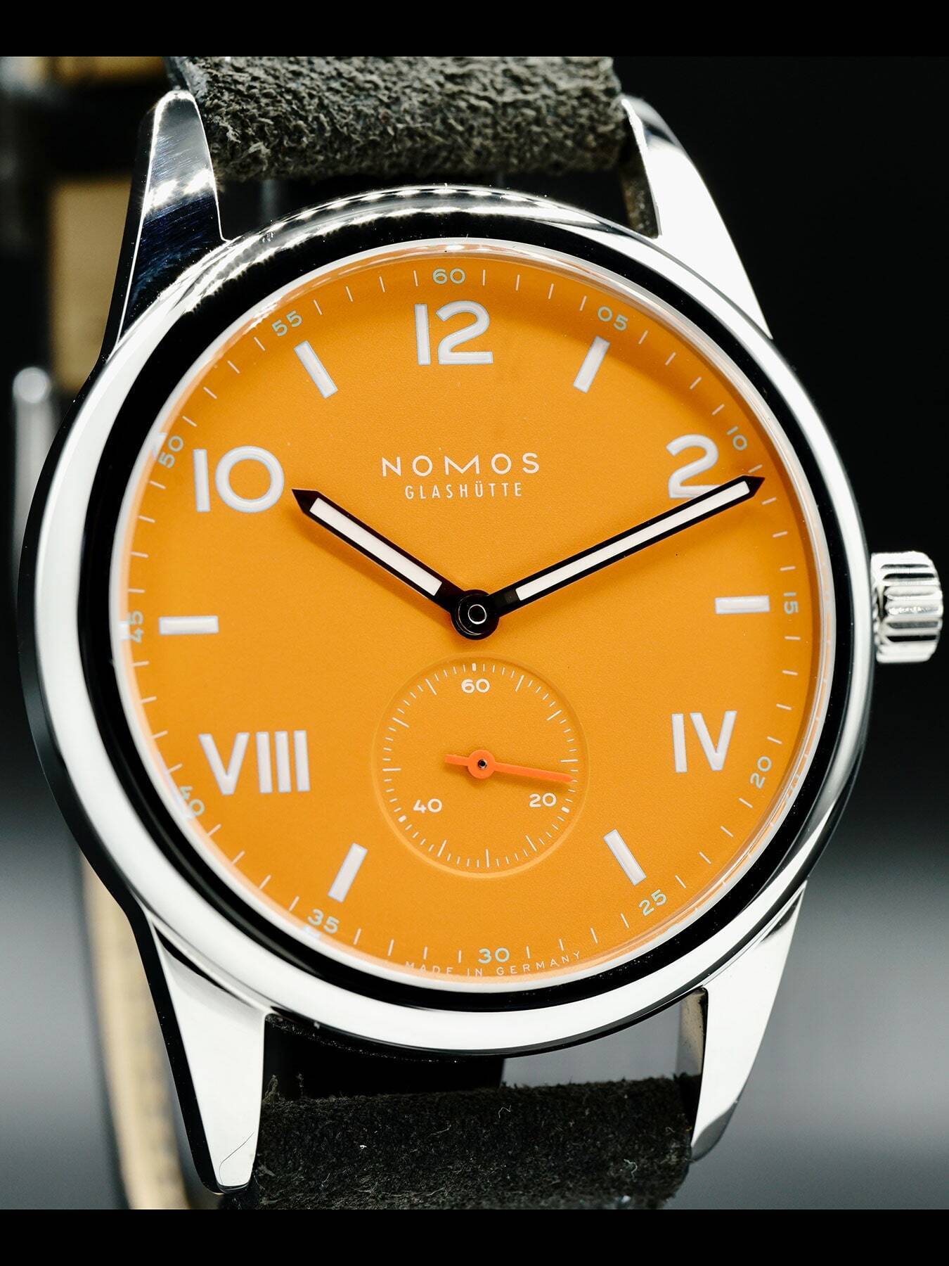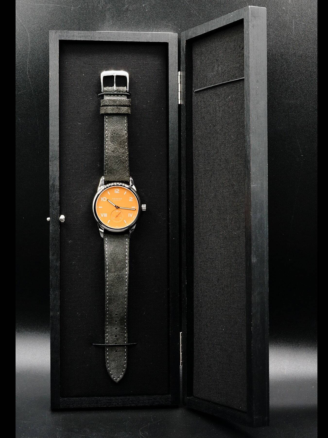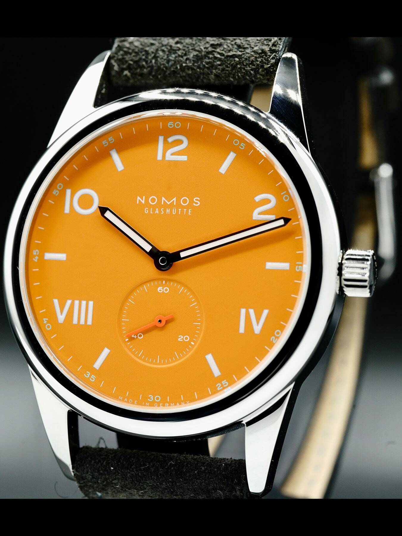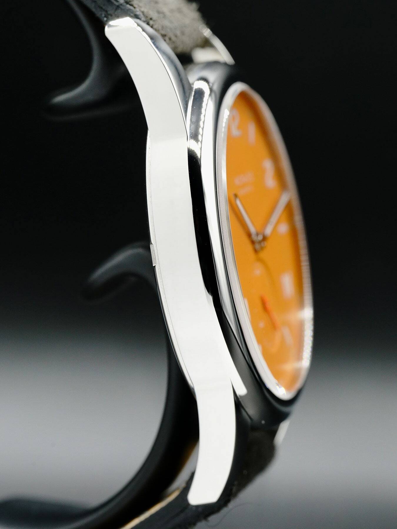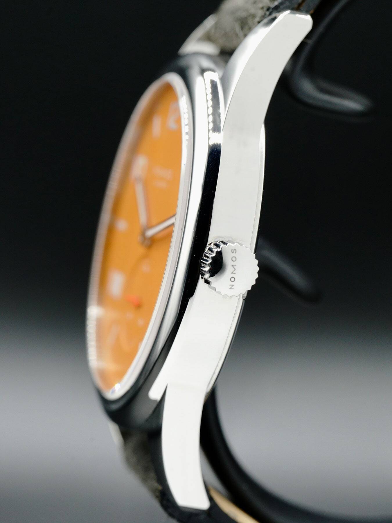 This NOMOS Glashütte features a 38.5mm stainless steel case with a solid case back on a black leather strap. This watch also sports an orange dial with luminous hands and Arabic & Roman numeral dial markers covered by scratch resistant sapphire crystal.