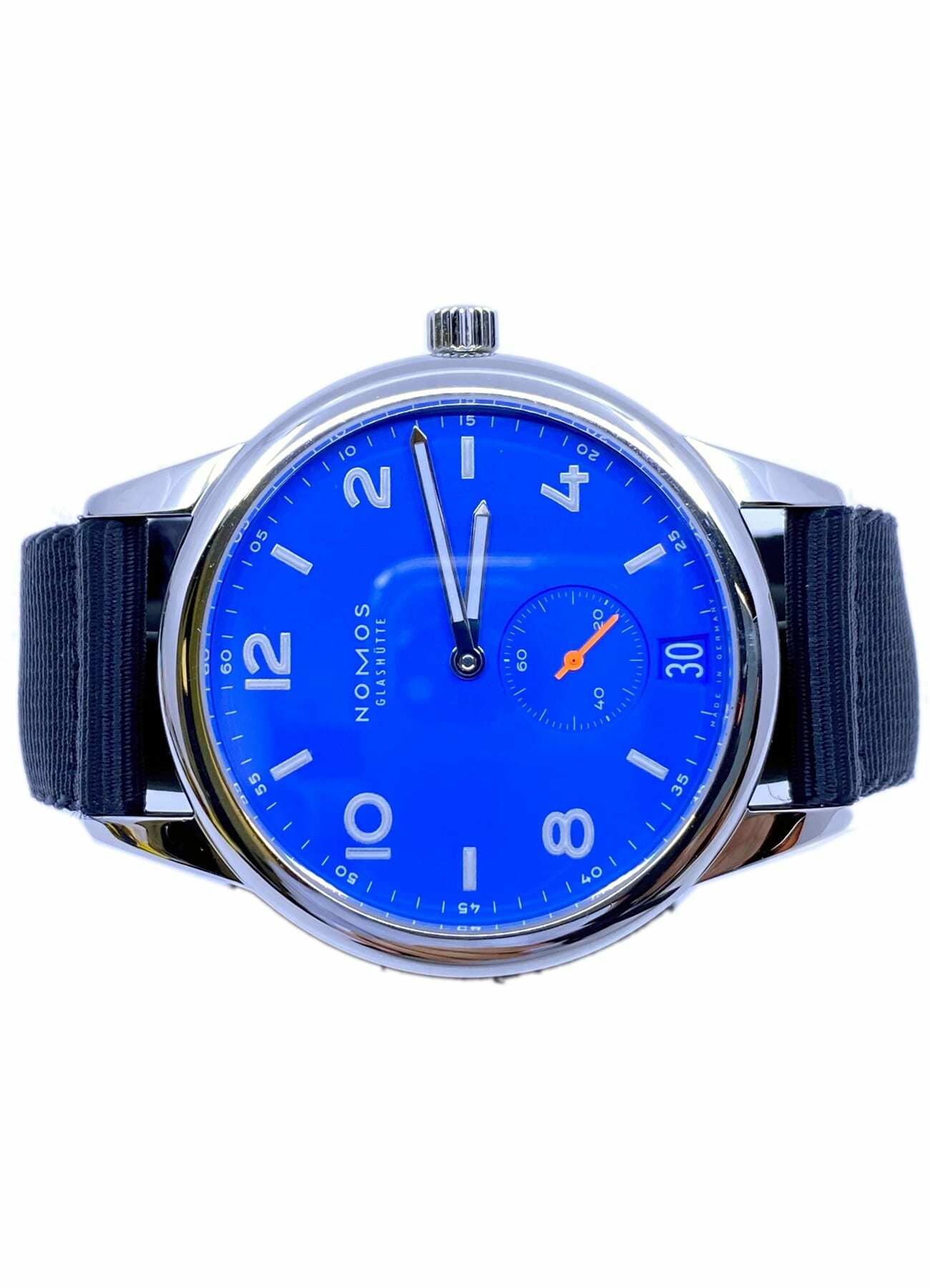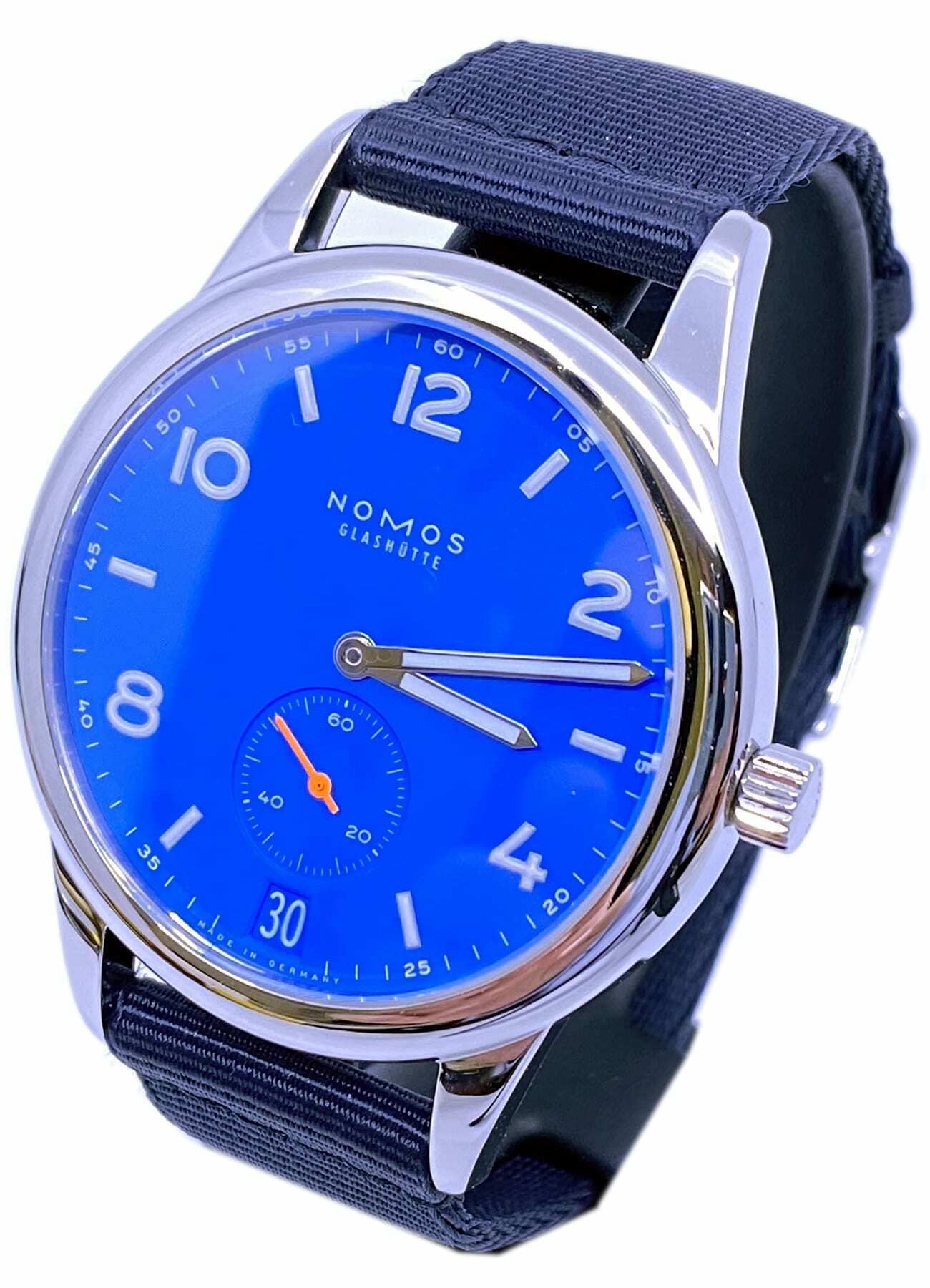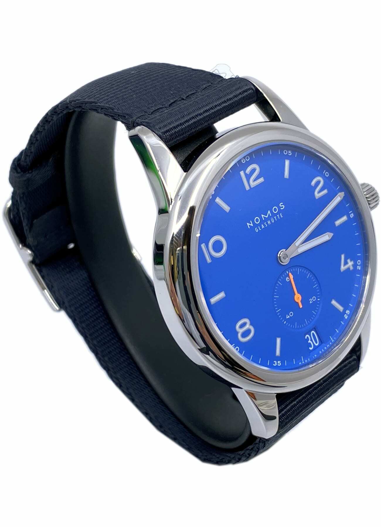 Club is in a league of its own. Reduced to the essentials, robust by nature. Now with a few differences typical to the Aqua series from NOMOS Glashütte: a blue that fell from the sky, a feeling of a never-ending summer for the wrist—and it is suitable for diving, water resistant to 20 atm, so 200 meters. Whether a few leagues under the sea, or in the dark of night, superluminova illuminates the time. All the while NOMOS caliber DUW 5101 turns motion into time with utmost precision (and it knows the date).