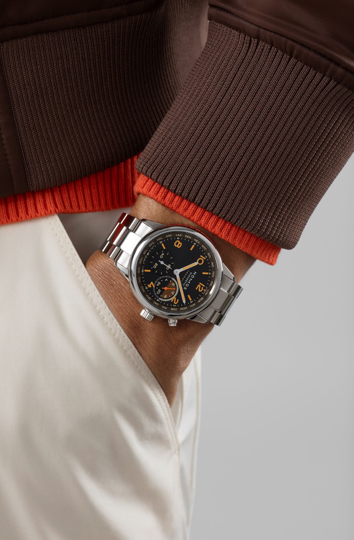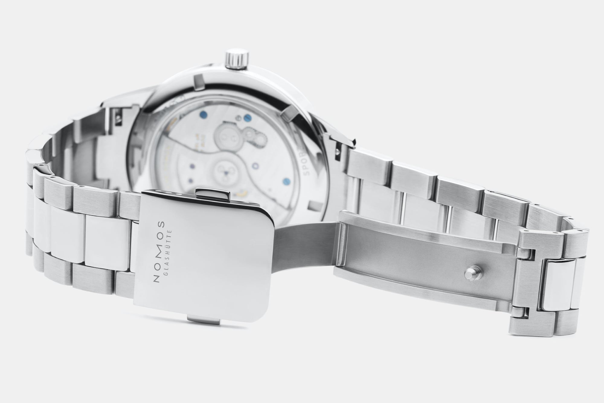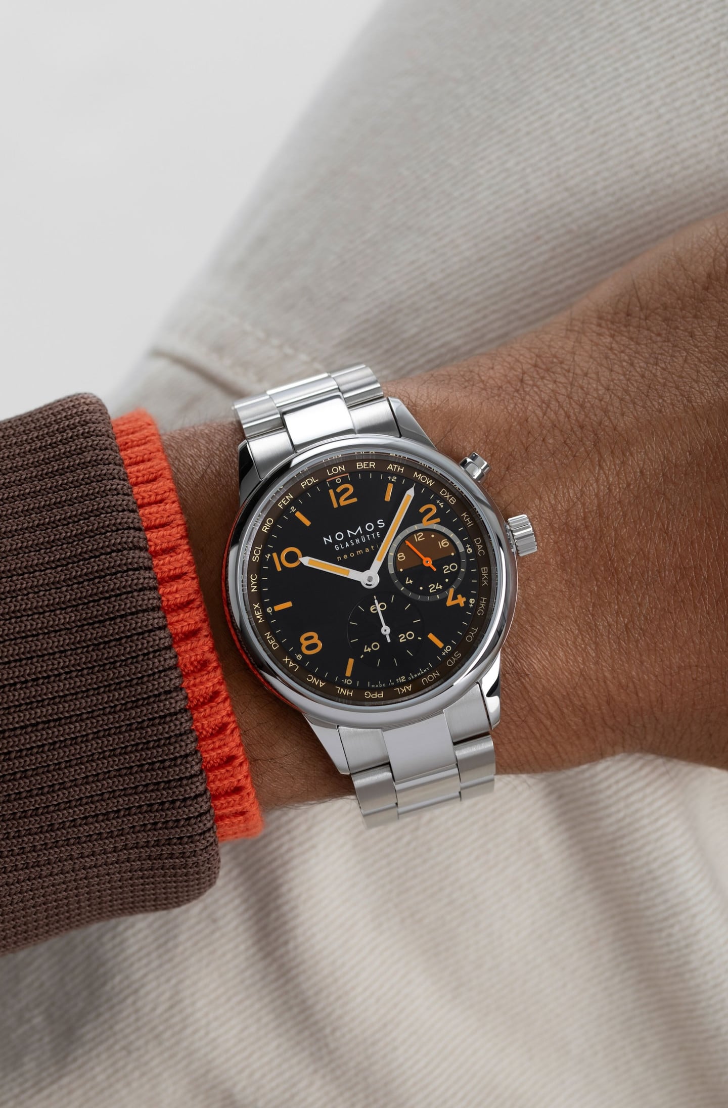 NOMOS Glashütte is known for the slim profile of its automatic watches. The robust Club Sport model with a worldtime mechanism is only 9.9 millimeters in height—making it one of the thinnest worldtimers to date.