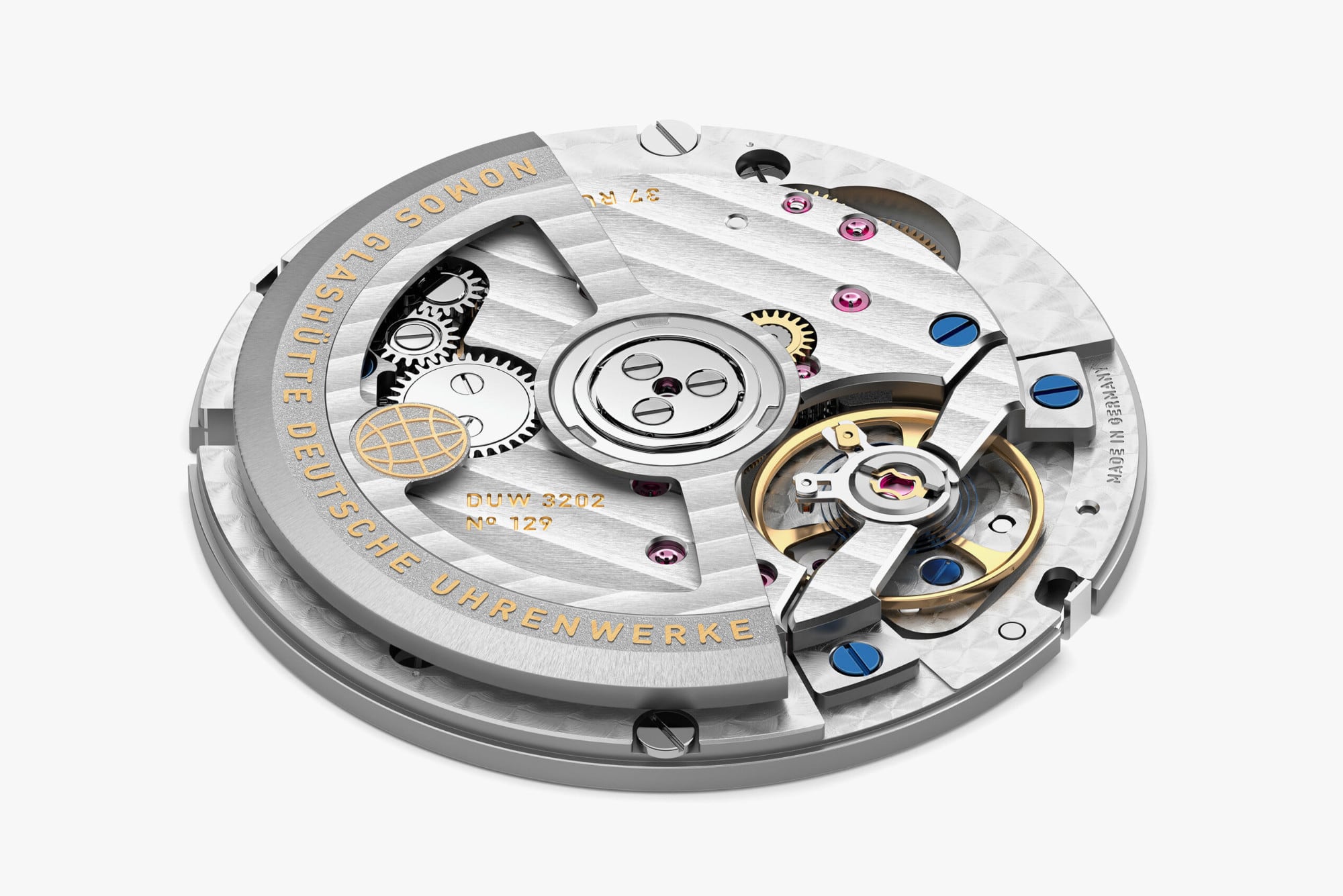 The globe in gold on the rotor, which can be seen here through the sapphire crystal case back, is the hallmark of the elegantly thin NOMOS worldtime movement DUW 3202. The complication is fully integrated into the innovative neomatik caliber.