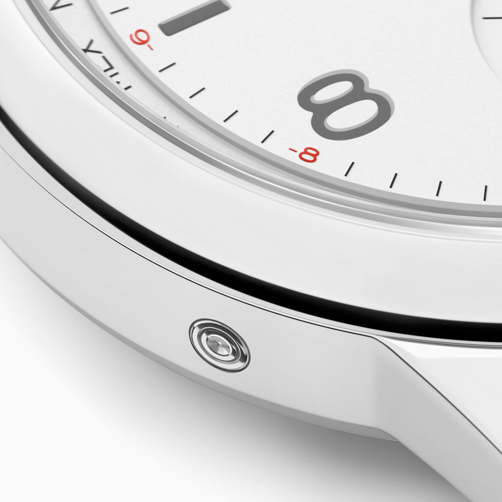 The corrector point set into the case at 8 o'clock is used to synchronize the main dial with the home time display. It is operated using a setting pin that is supplied with the watch.