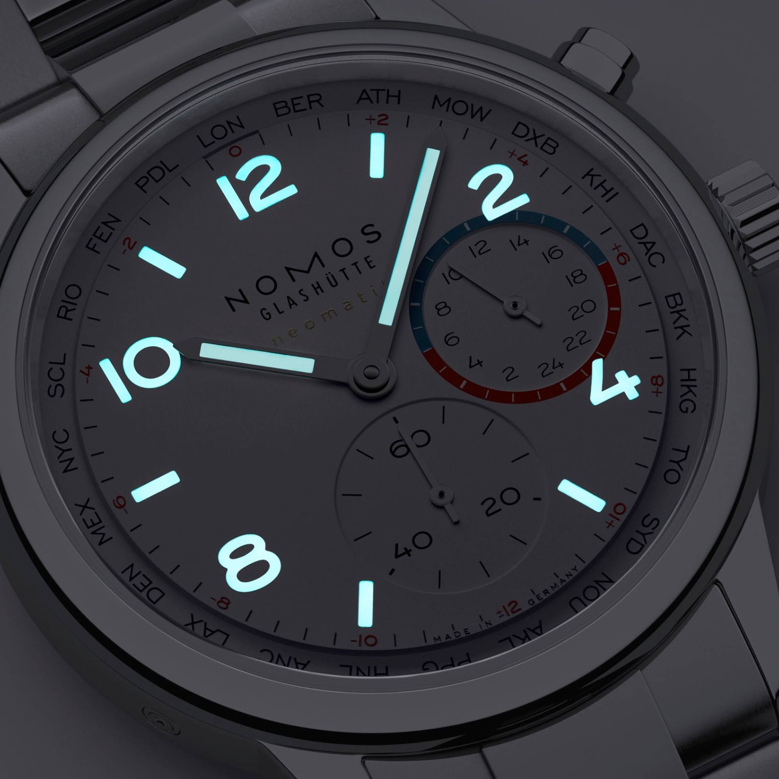 NOMOS Glashütte is known for the slim profile of its automatic watches. The robust Club Sport model with a worldtime mechanism is only 9.9 millimeters in height—making it one of the thinnest worldtimers yet.