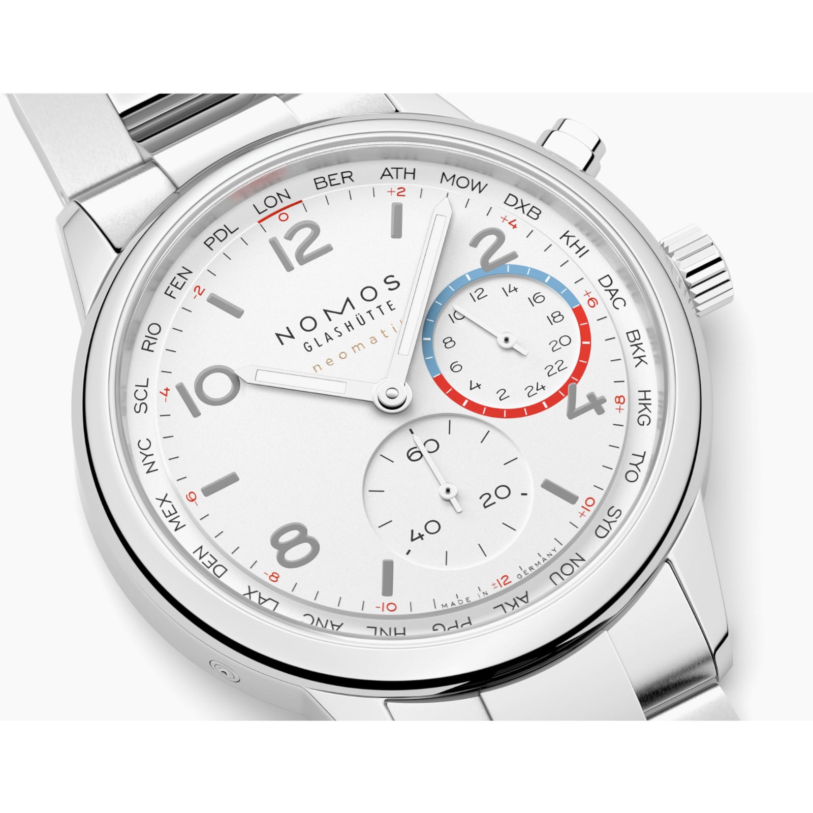 Made for life across time zones: With a white silver-plated dial, the multilayered display of Club Sport neomatik Worldtimer takes on a streamlined appearance. This worldtime watch is versatile and perfect for everyday use, elegantly slim yet full of functional features. Superluminova – white on the hands and gray on the hour indexes – glows blue in low-light conditions. Otherwise, the only touches of color are the small red numerals around the edge of the main dial, the red marker highlighting the local time, and the outer ring of the home time subdial.