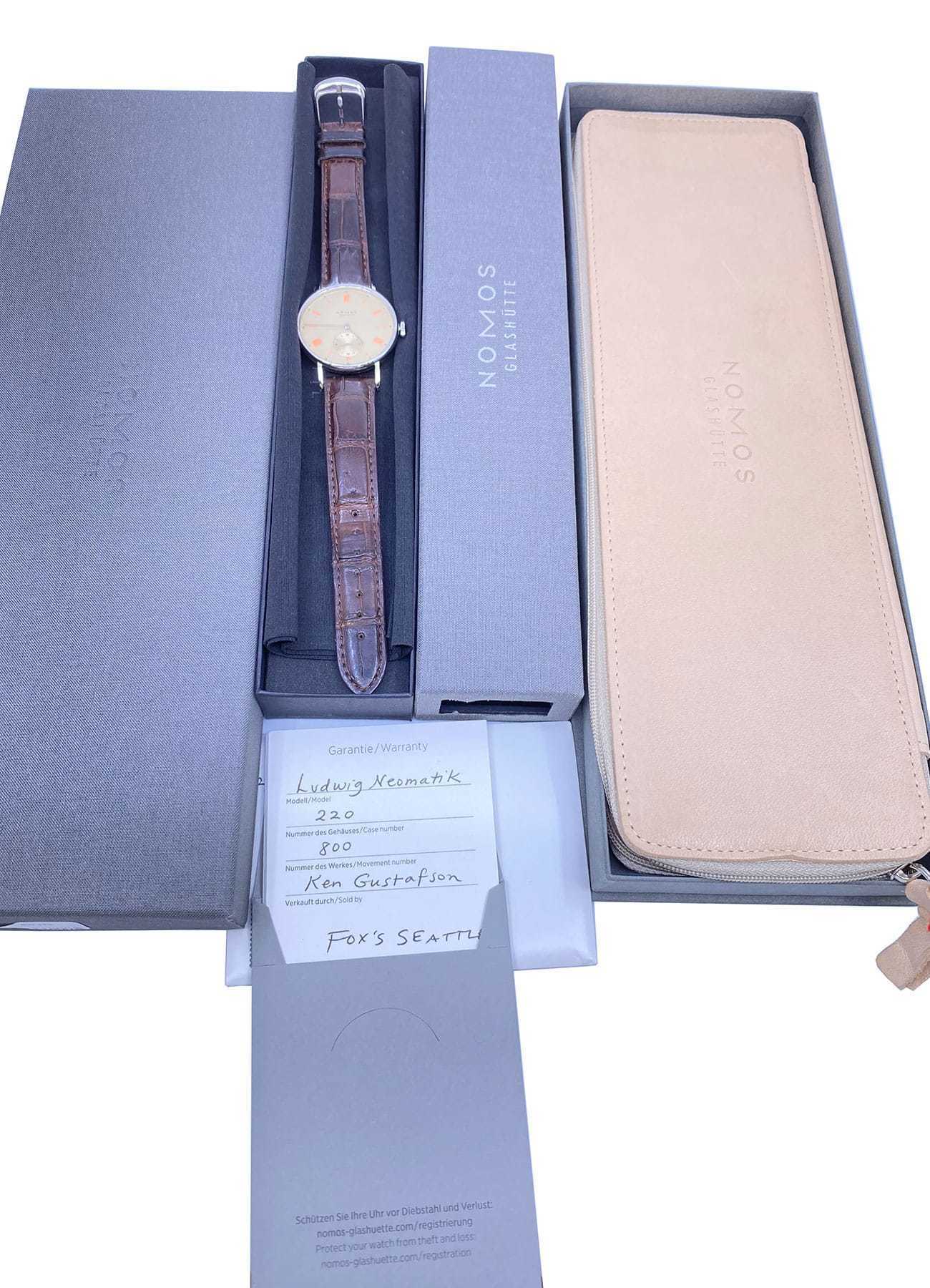 This NOMOS Glashütte Ludwig Neomatik Champagner 1st Edition is in EXCELLENT condition. This watch includes its original box and papers. Very RARE piece.