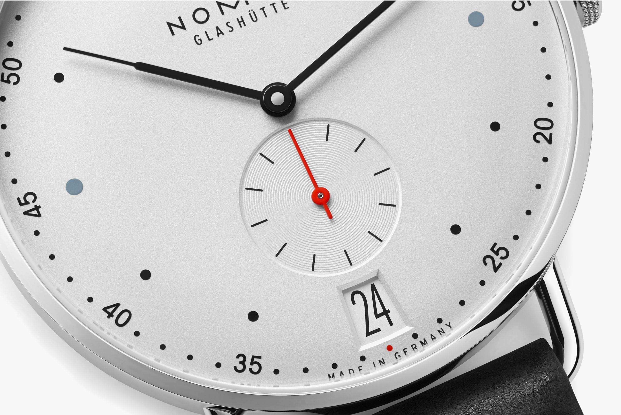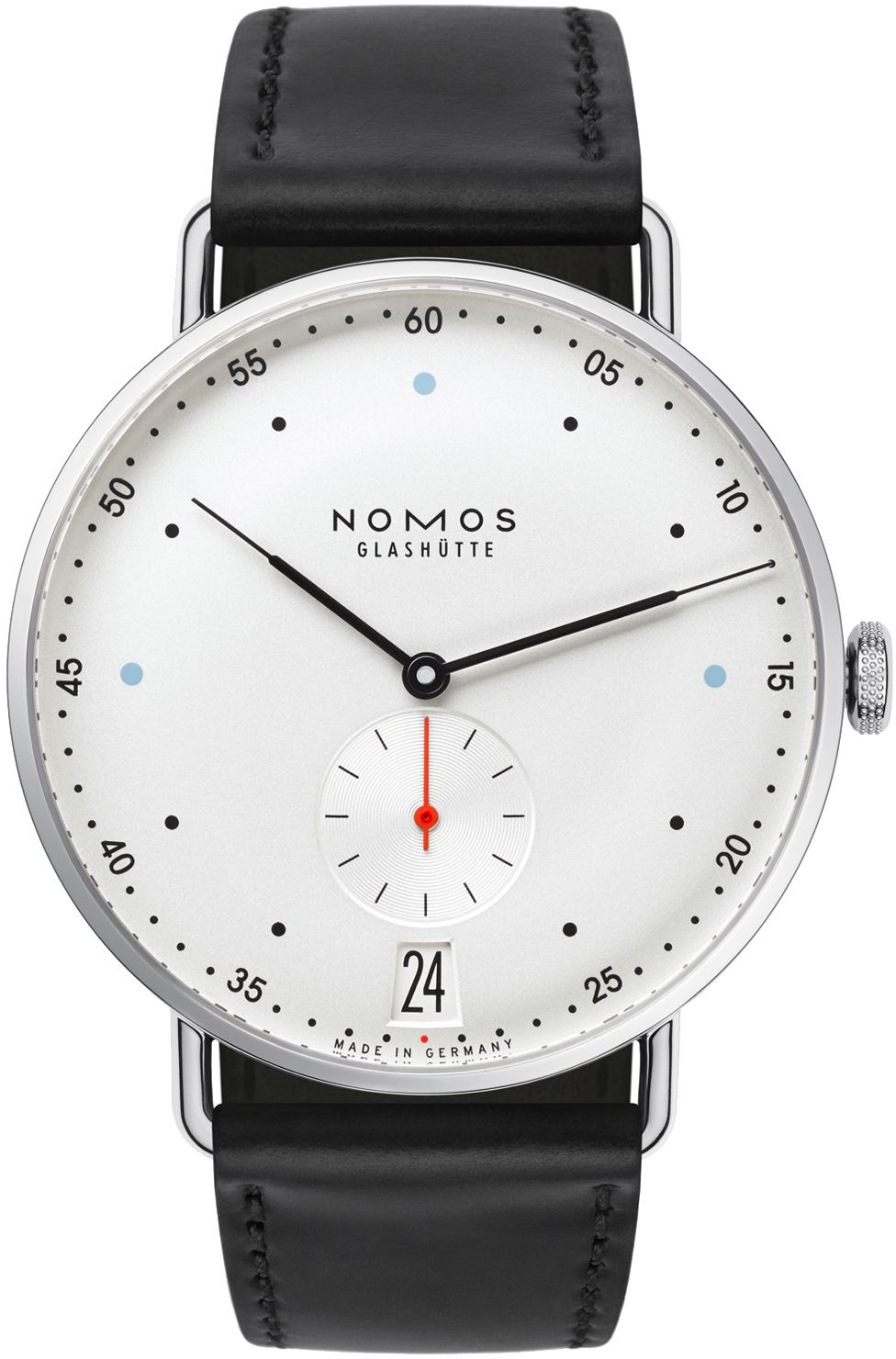 Wonderfully beautiful, well proportioned, and clear: That is Metro 38 Datum. The sister model to Metro is a touch (or 1.5 millimeters, to be exact) larger than the original Metro-and since it does without a power reserve indicator, also a tick more paired-down. The white silver-plated dial with the NOMOS long-distance date appears elegant and modern, while the blue hour indexes at three, nine, and twelve contrast beautifully with the red seconds hand. And of course, Metro 38 Datum has swing; which is to say, it features the NOMOS swing system.