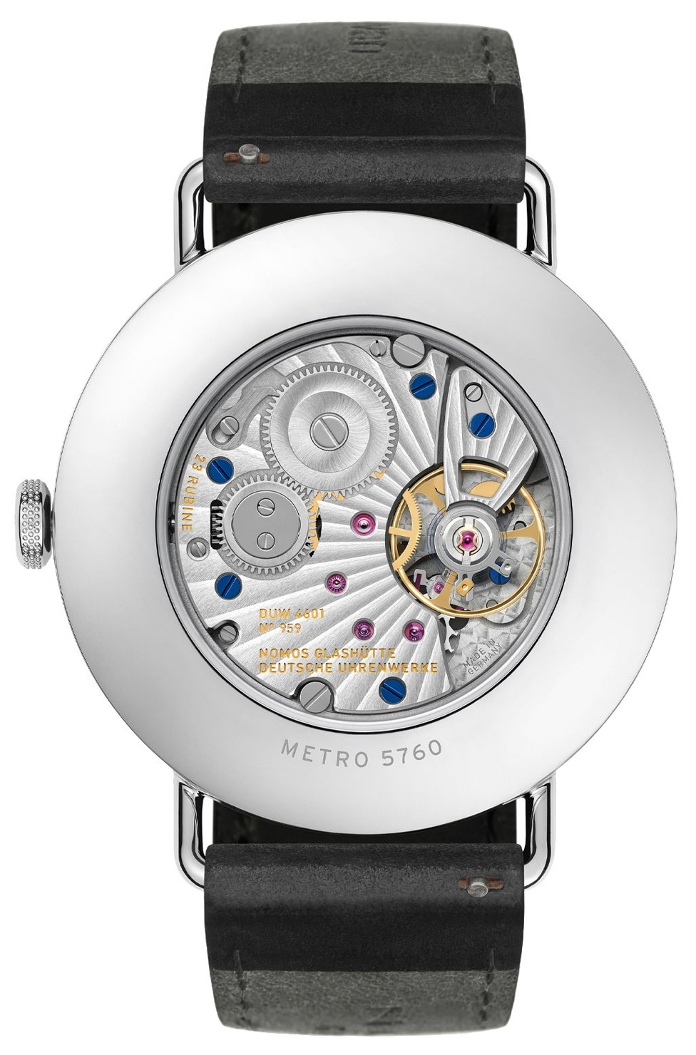 DUW 4101-NOMOS caliber with manual winding and date indicator; NOMOS swing system with tempered blue balance spring