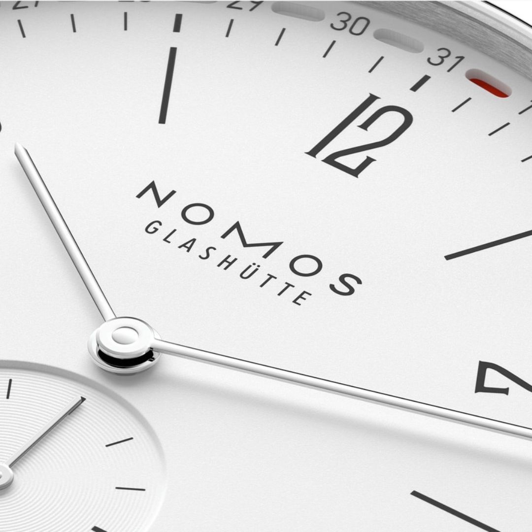 Love at second glance too: This Tangente with a diameter of 37.5 millimeters has two date displays in red that complement each other harmoniously. The exclusive NOMOS ring date—in a hand-wound watch for the first time here—shows the entire month; meanwhile, the large date window at 6 o'clock focuses on the current date. At midnight or when the quickset function is activated, the two displays set the white silver-plated dial with rhodium-plated hands in motion in a way that is doubly beautiful.