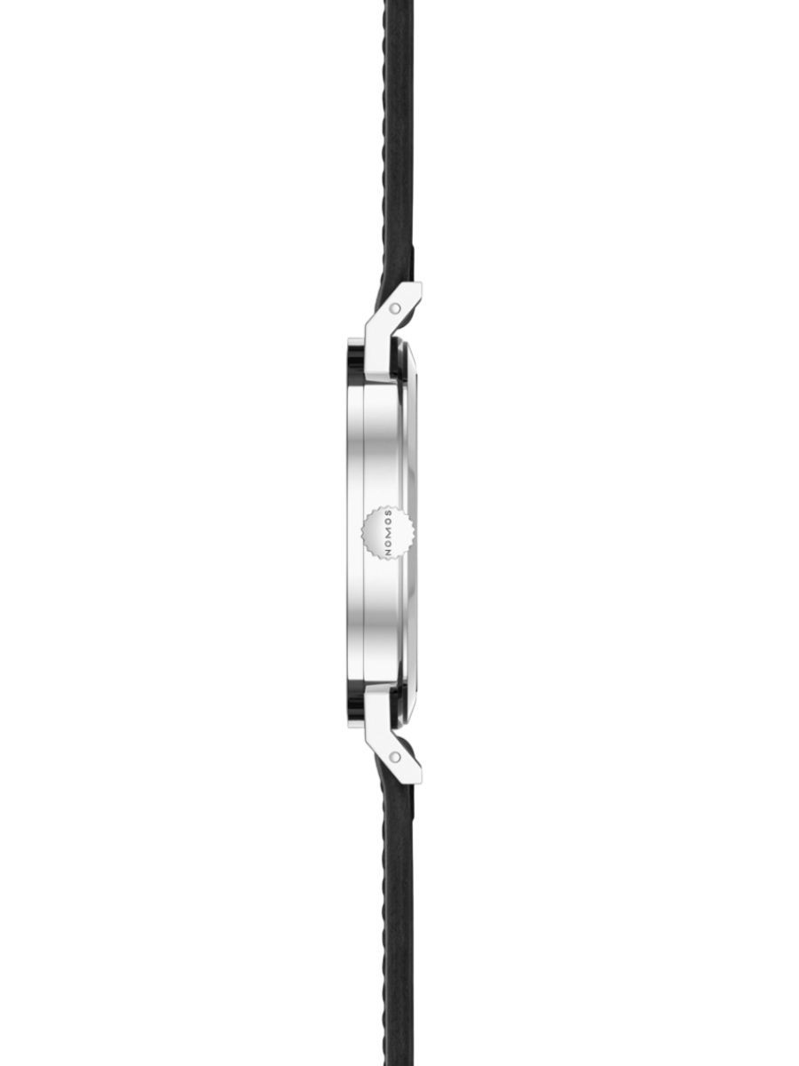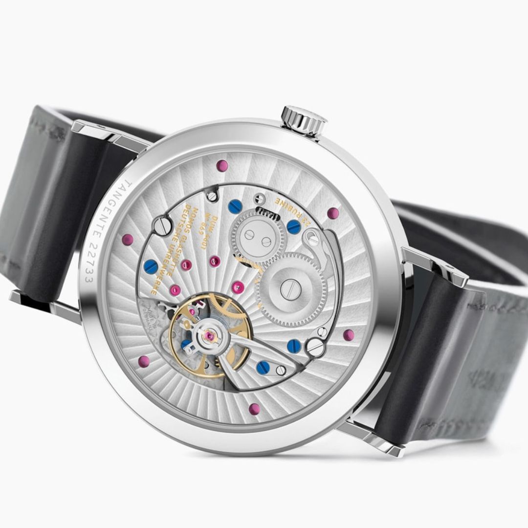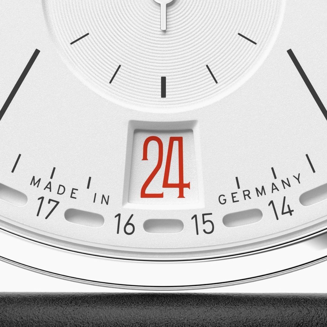 Love at second glance too: This Tangente with a diameter of 37.5 millimeters has two date displays in red that complement each other harmoniously. The exclusive NOMOS ring date—in a hand-wound watch for the first time here—shows the entire month; meanwhile, the large date window at 6 o'clock focuses on the current date. At midnight or when the quickset function is activated, the two displays set the white silver-plated dial with rhodium-plated hands in motion in a way that is doubly beautiful.