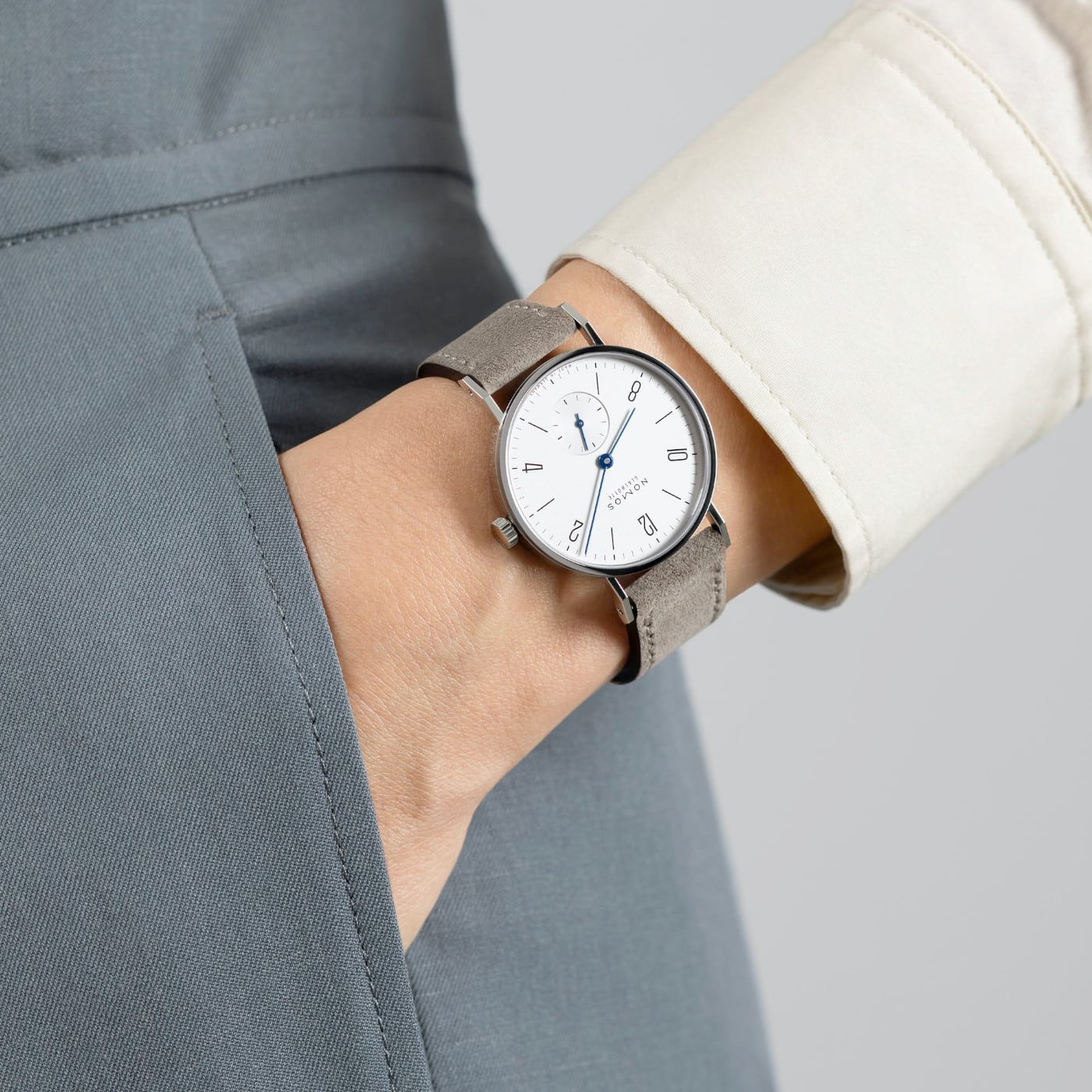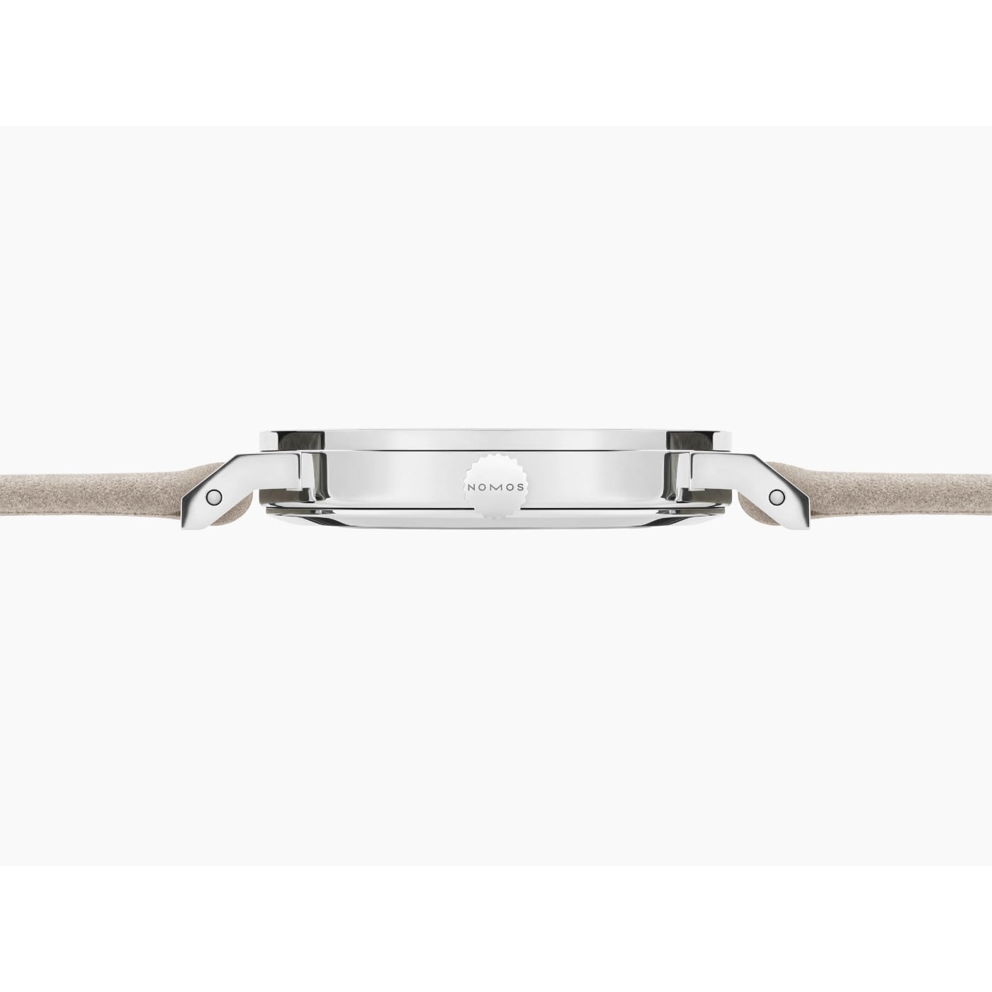 The classic, but more delicate-people are different, after all. This model has the finest proportions with a diameter of just 33 millimeters. A truly beautiful watch powered by the manually wound Alpha movement and, like all smaller NOMOS models, with a delicate velour strap.