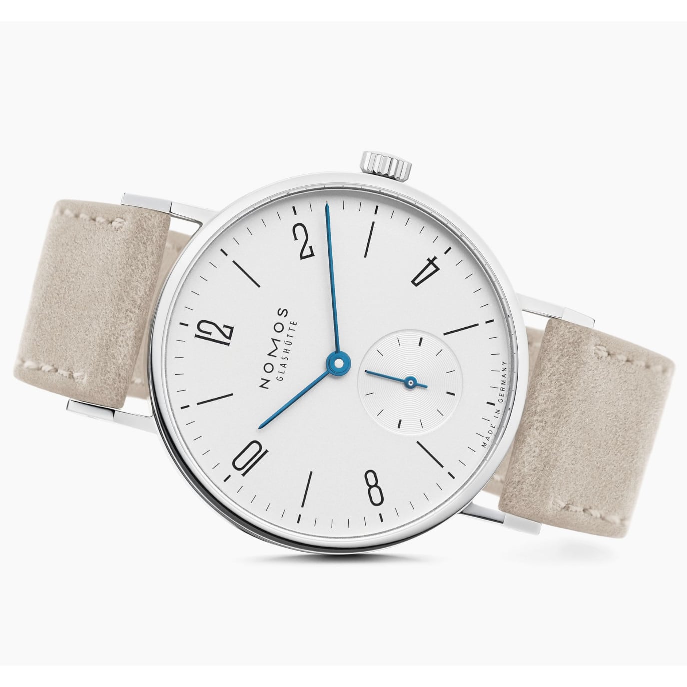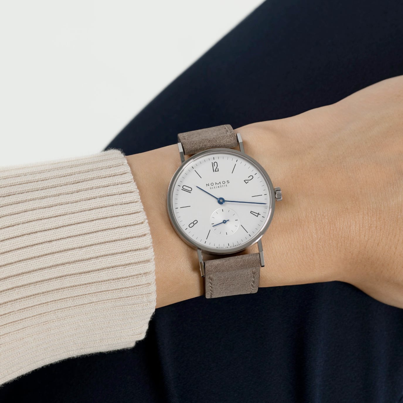 The classic, but more delicate-people are different, after all. This model has the finest proportions with a diameter of just 33 millimeters. A truly beautiful watch powered by the manually wound Alpha movement and, like all smaller NOMOS models, with a delicate velour strap.
