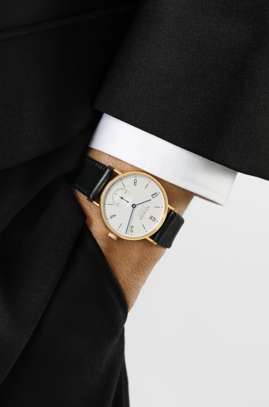 The black leather strap, crafted from Horween Genuine Shell Cordovan, perfectly complements the 18-kt gold case, while a solid gold clasp ensures Tangente gold neomatik stays secure and comfortable on the wrist.