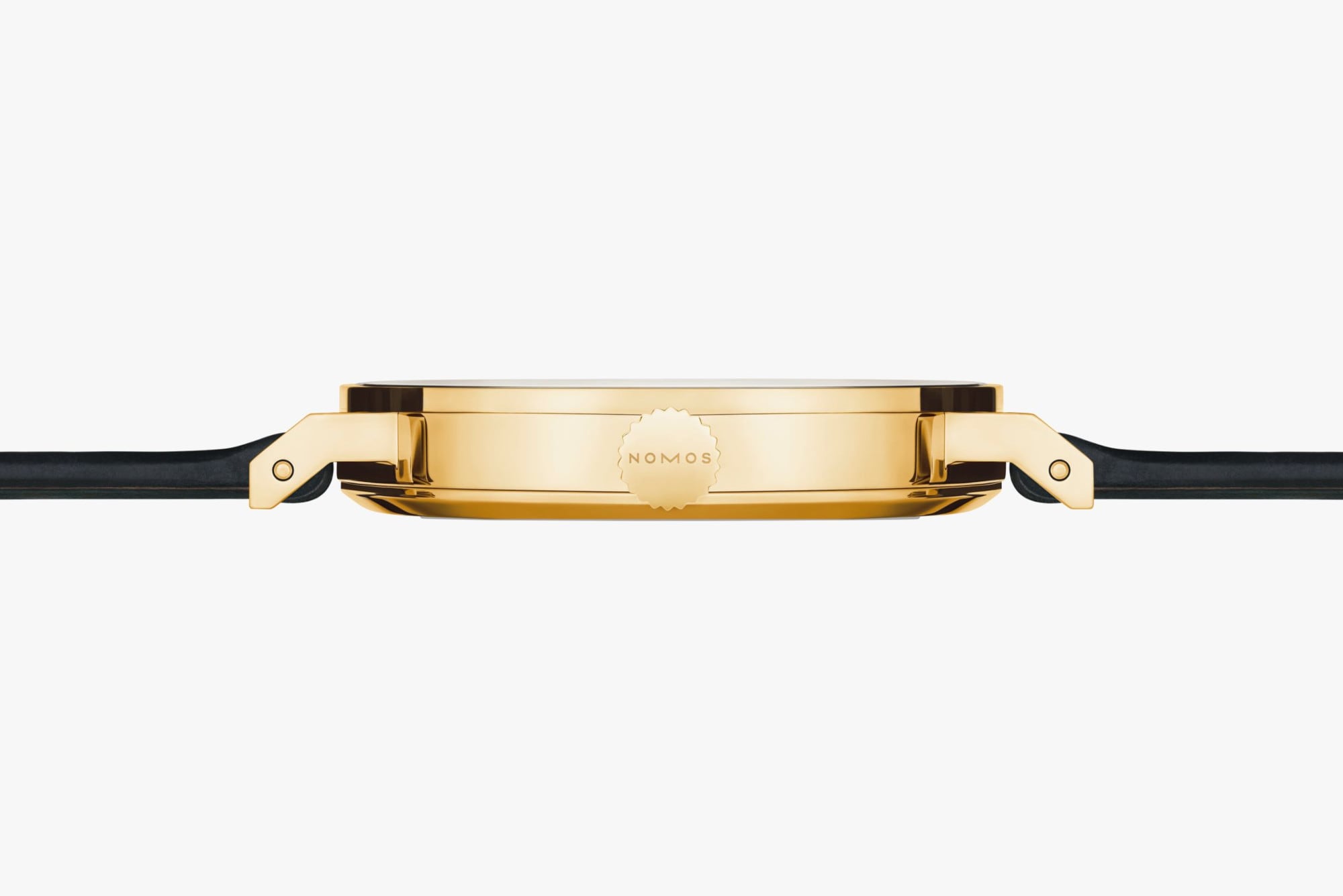 Tangente gold neomatik from NOMOS Glashütte embodies classic elegance in 18-karat gold. Its slender case and clear Bauhaus-inspired design exude refined simplicity, complemented by a black leather strap crafted from Horween Genuine Shell Cordovan. Powered by DUW 3001, the ultra-thin automatic caliber from NOMOS Glashütte, this masterpiece pairs modern precision with enduring beauty.