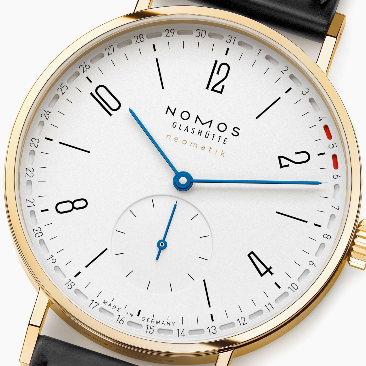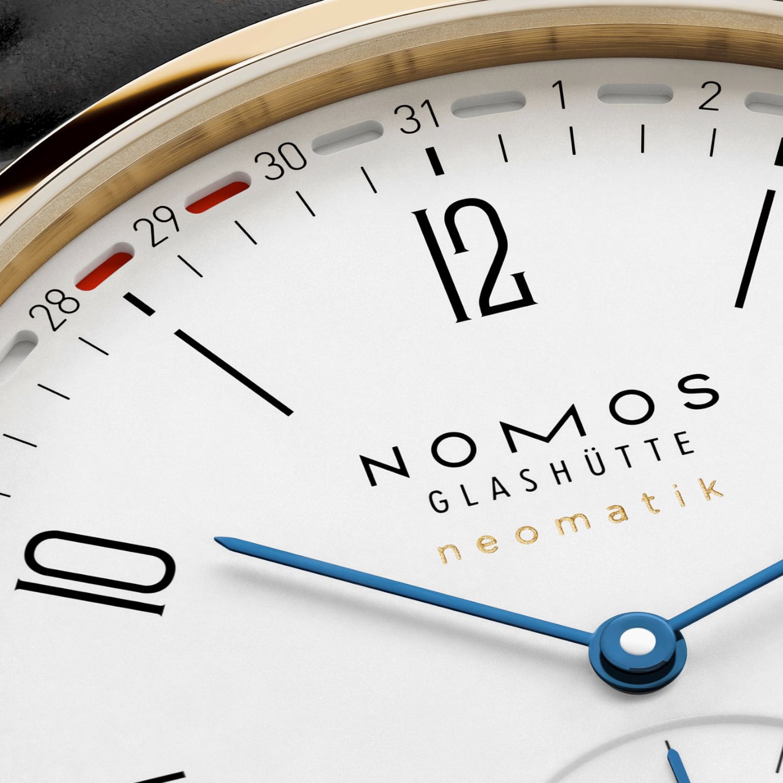In all NOMOS calibers, the date ring is placed around the movement. In neomatik date, this caliber is particularly large. The first neomatik caliber with a date mechanism, it remains wonderfully slender. The date display can be made even clearer, and is particularly legible.