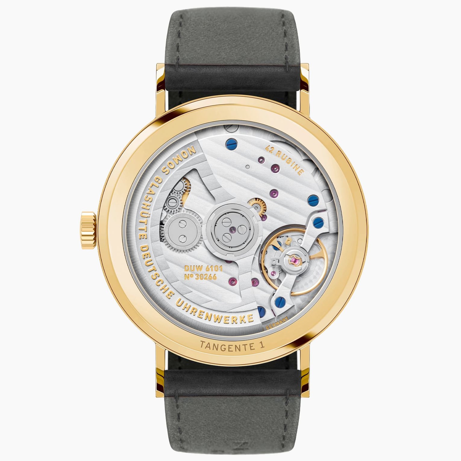 The sapphire crystal case back offers a view of the movement: the in-house DUW 6101 features a patented date mechanism that can be adjusted quickly and reliably in both directions with only a very short locking time. The power reserve is 50 hours.