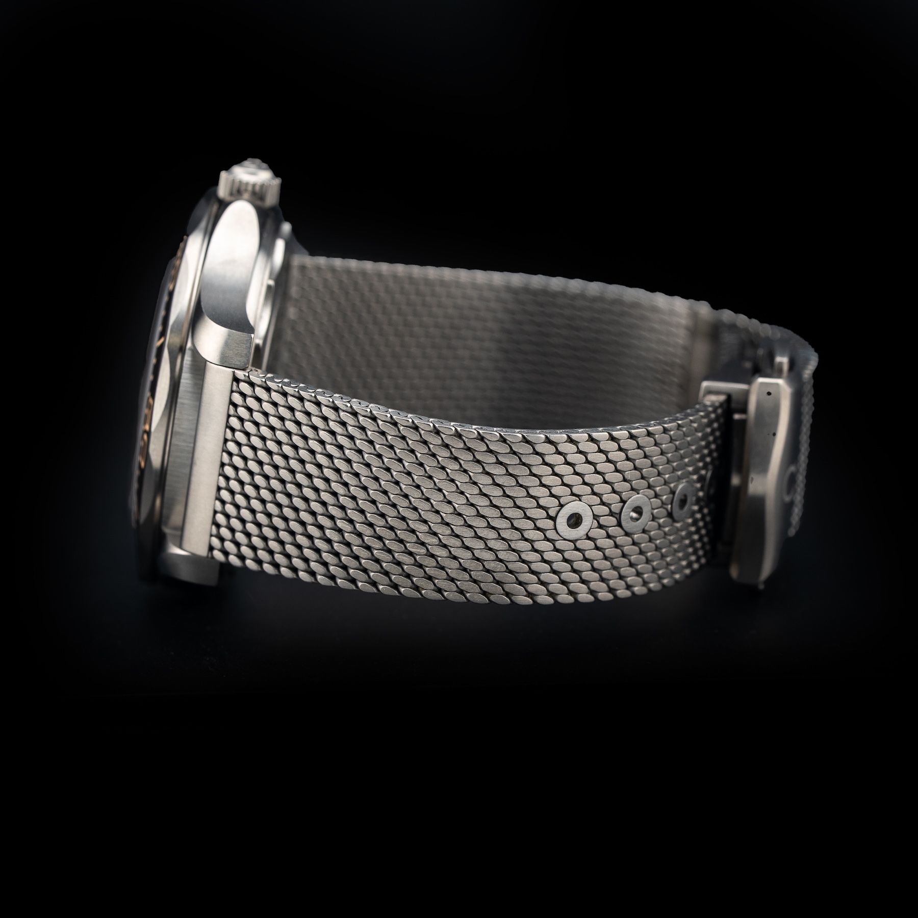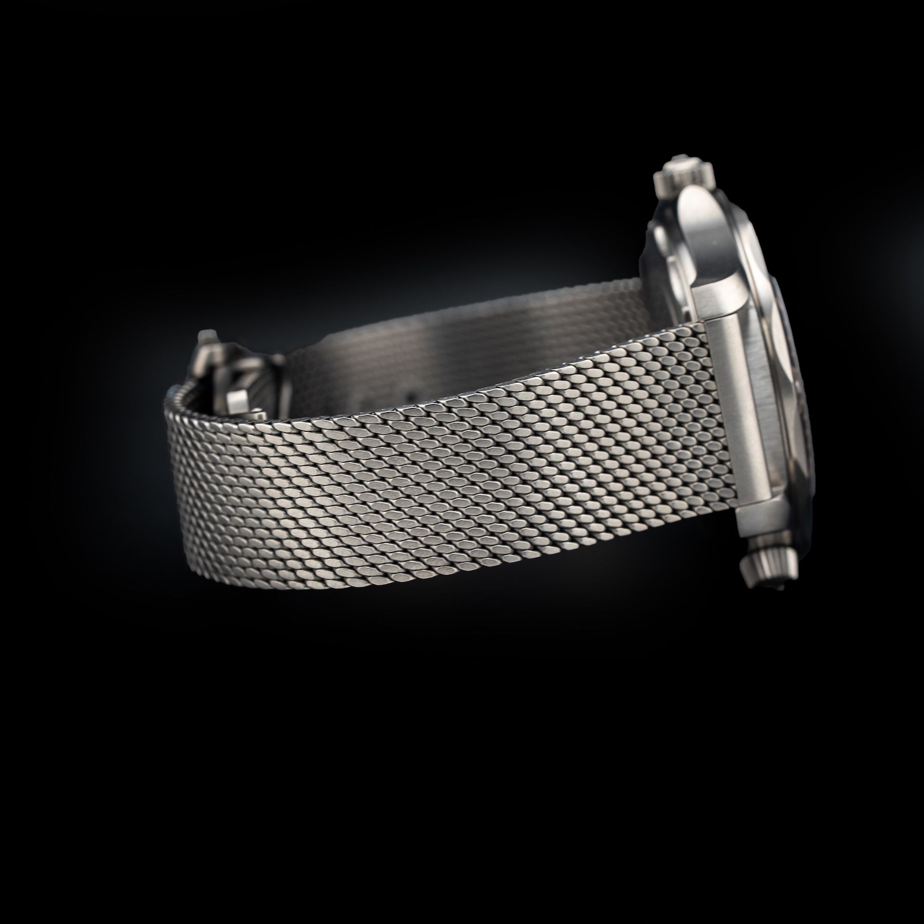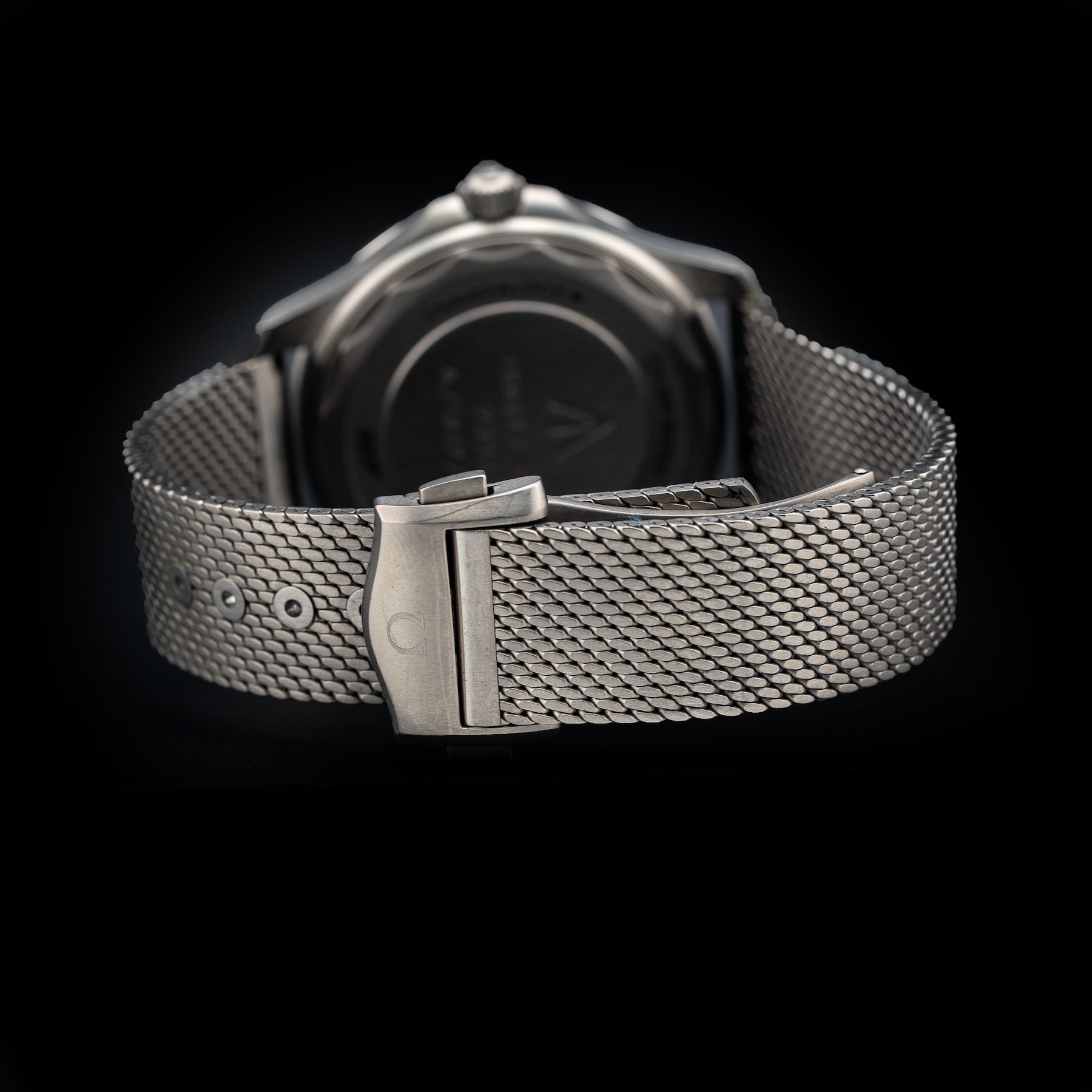 - This timepiece features a 43mm titanium case paired with a high quality steel bracelet. It showcases a distinctive black dial and is powered by a precise automatic winding movement. The watch is designed with a water resistance of up to 300m.