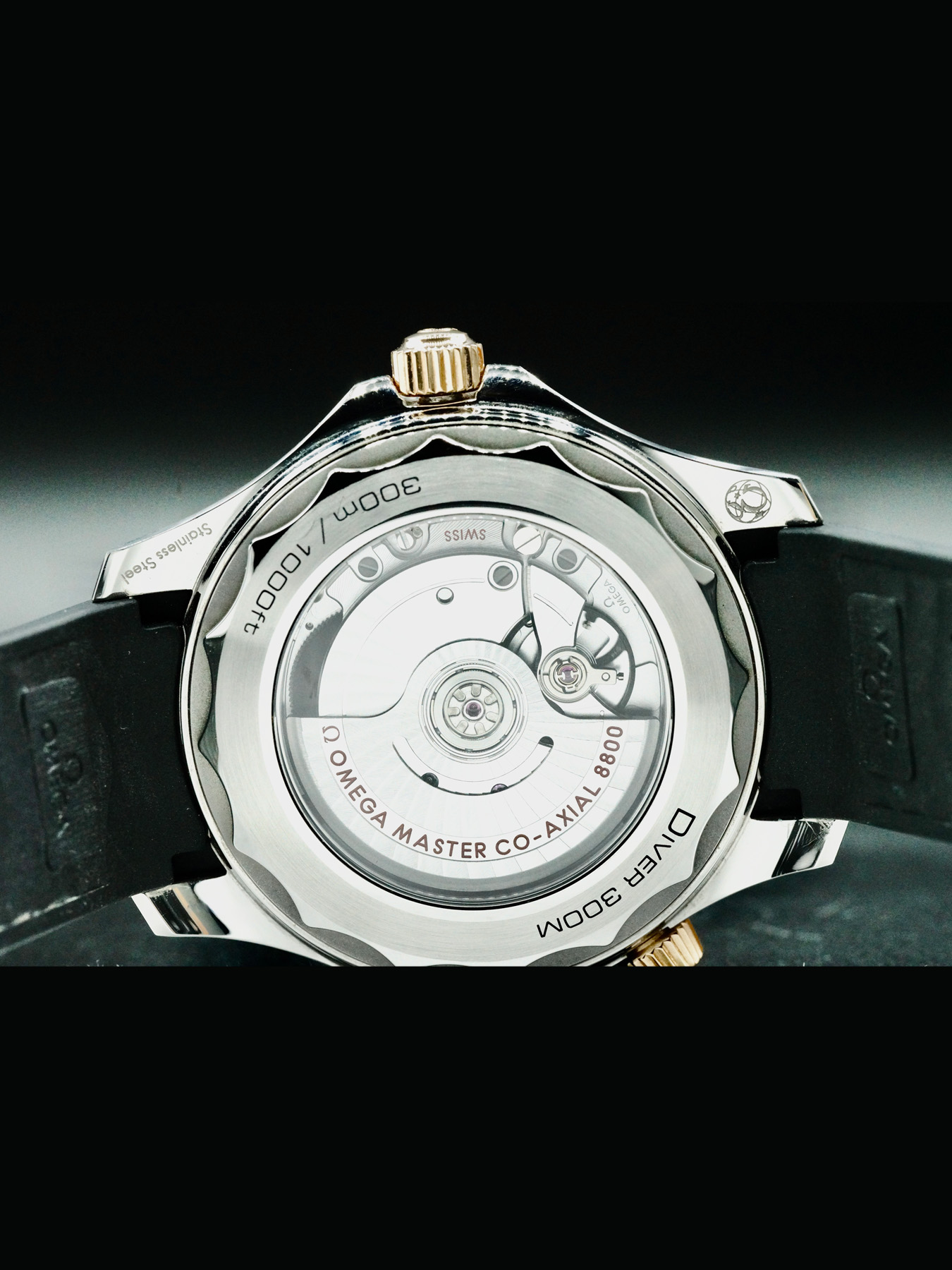 This watch features a 42mm stainless steel and sedna gold case on steel bracelet. This watch also sports a black dial. Powered by a mechanical automatic movement. Water resistance up to 300 meters.