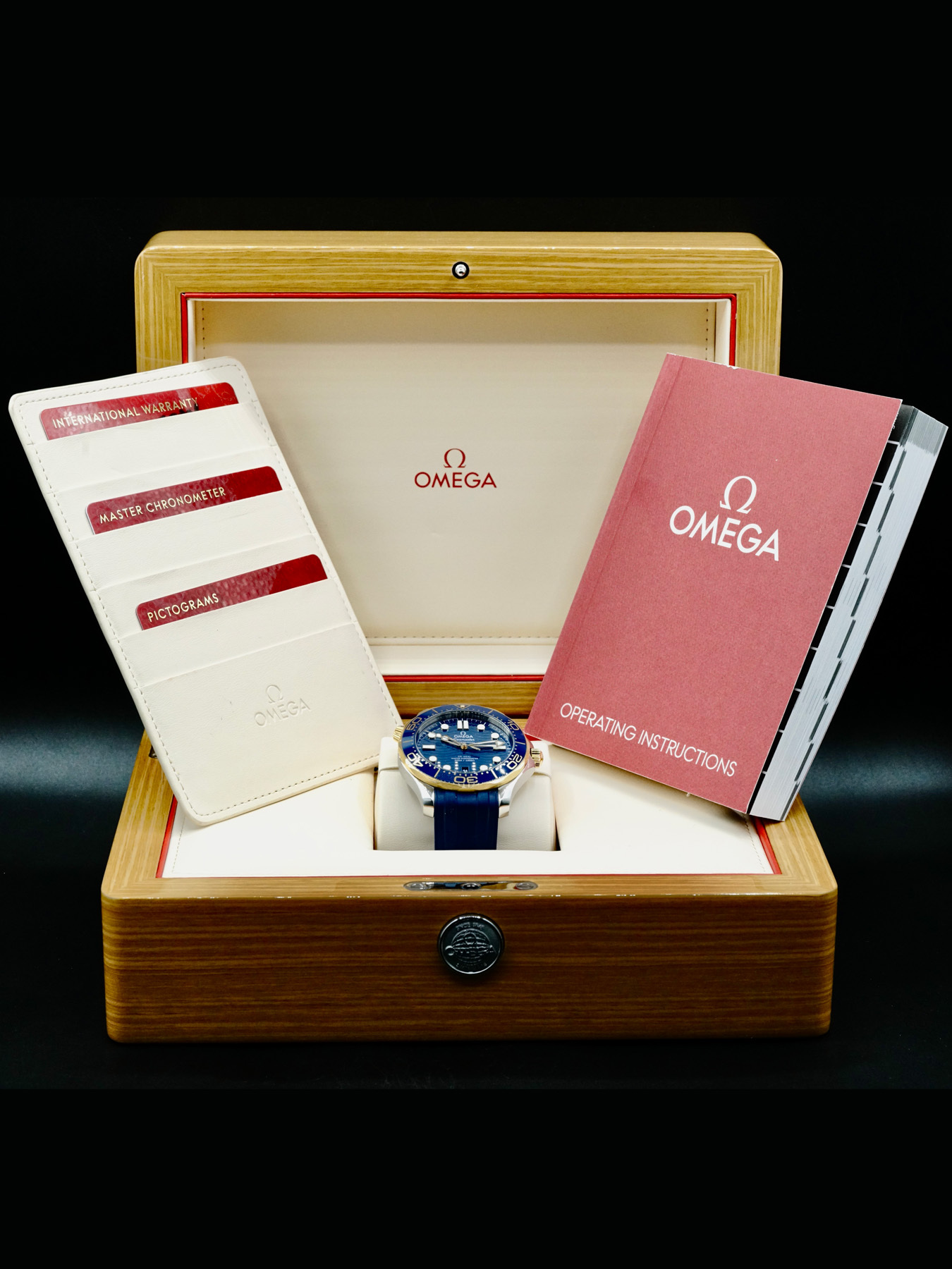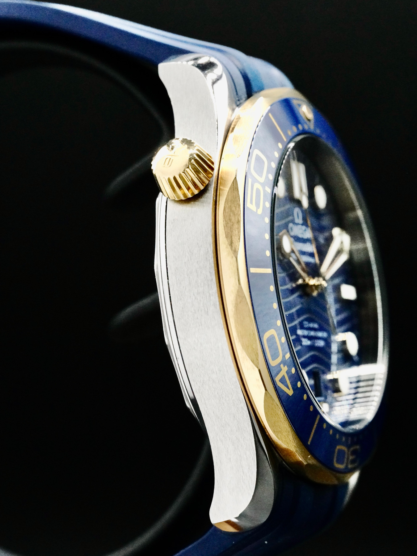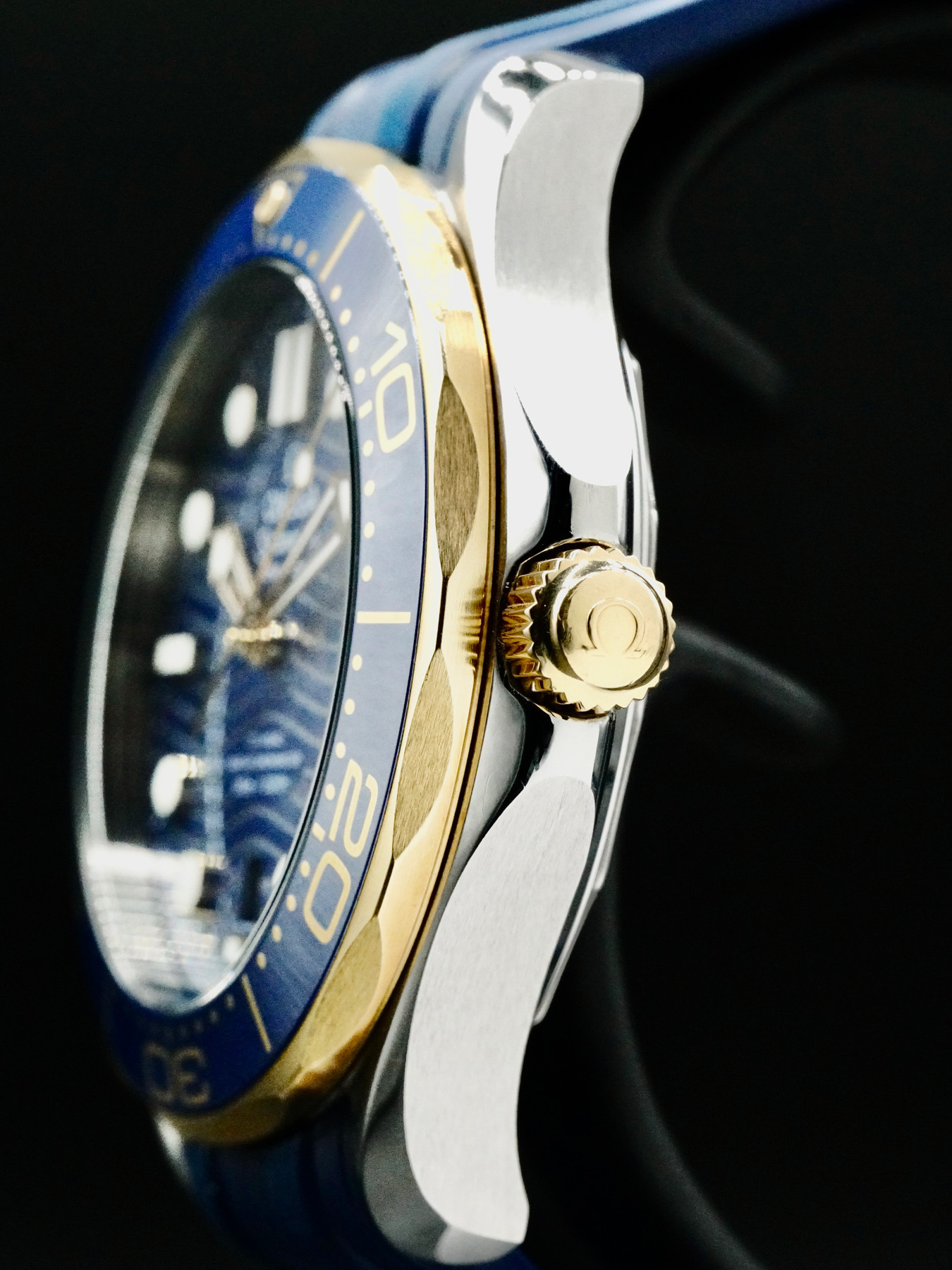 This Omega Seamaster Diver 300M features a 42mm stainless steel & yellow gold case with a display case back on a blue rubber strap. This watch also sports a blue dial with luminous hands and index dial markers covered by scratch resistant sapphire crystal.