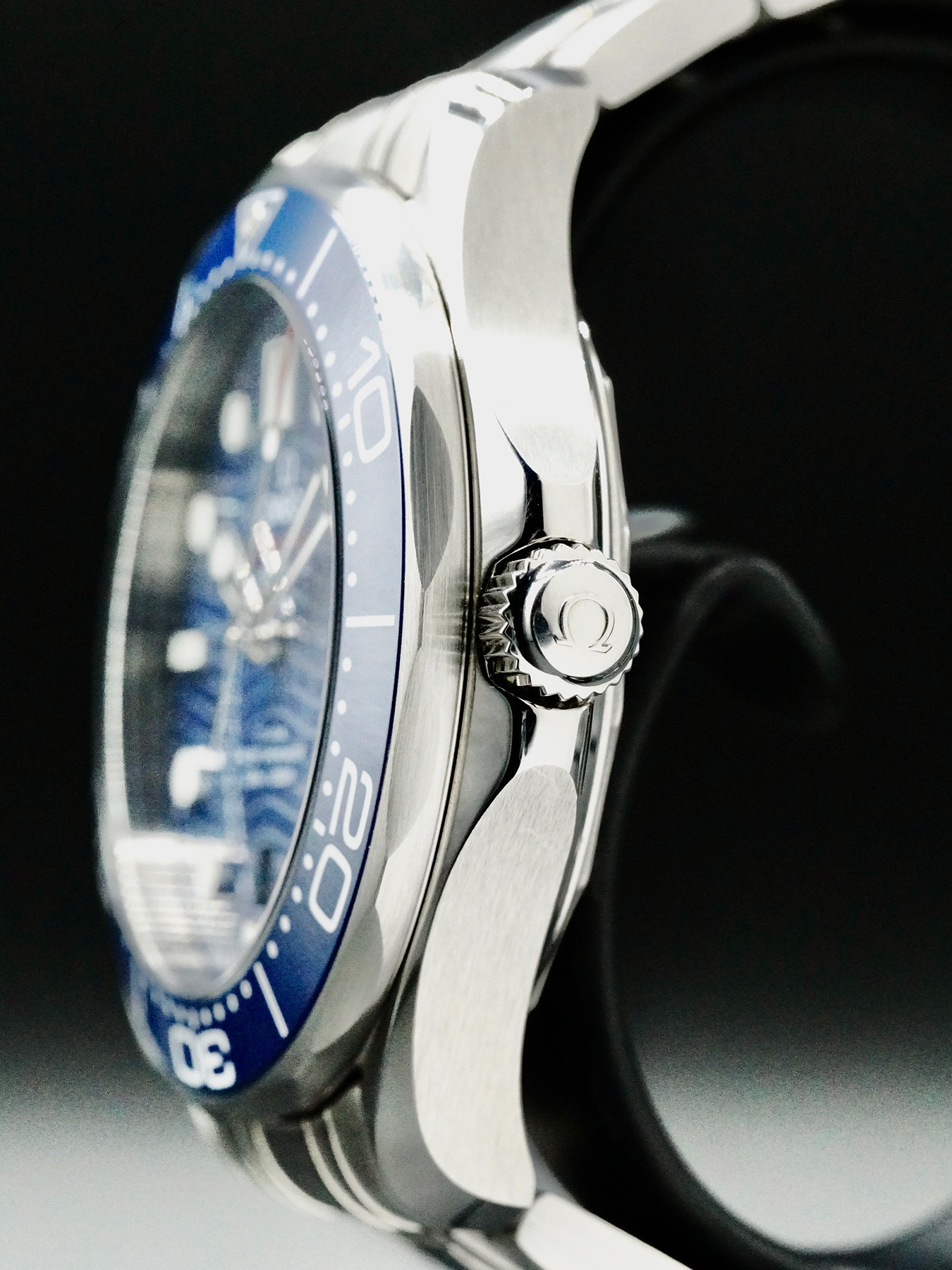 This Omega Seamaster Diver 300M features a 42mm stainless steel case with a blue ceramic bezel and a display case back on a stainless steel bracelet. This watch also sports a blue dial with luminous hands, index dial markers, and date display covered by anti-reflective sapphire crystal.