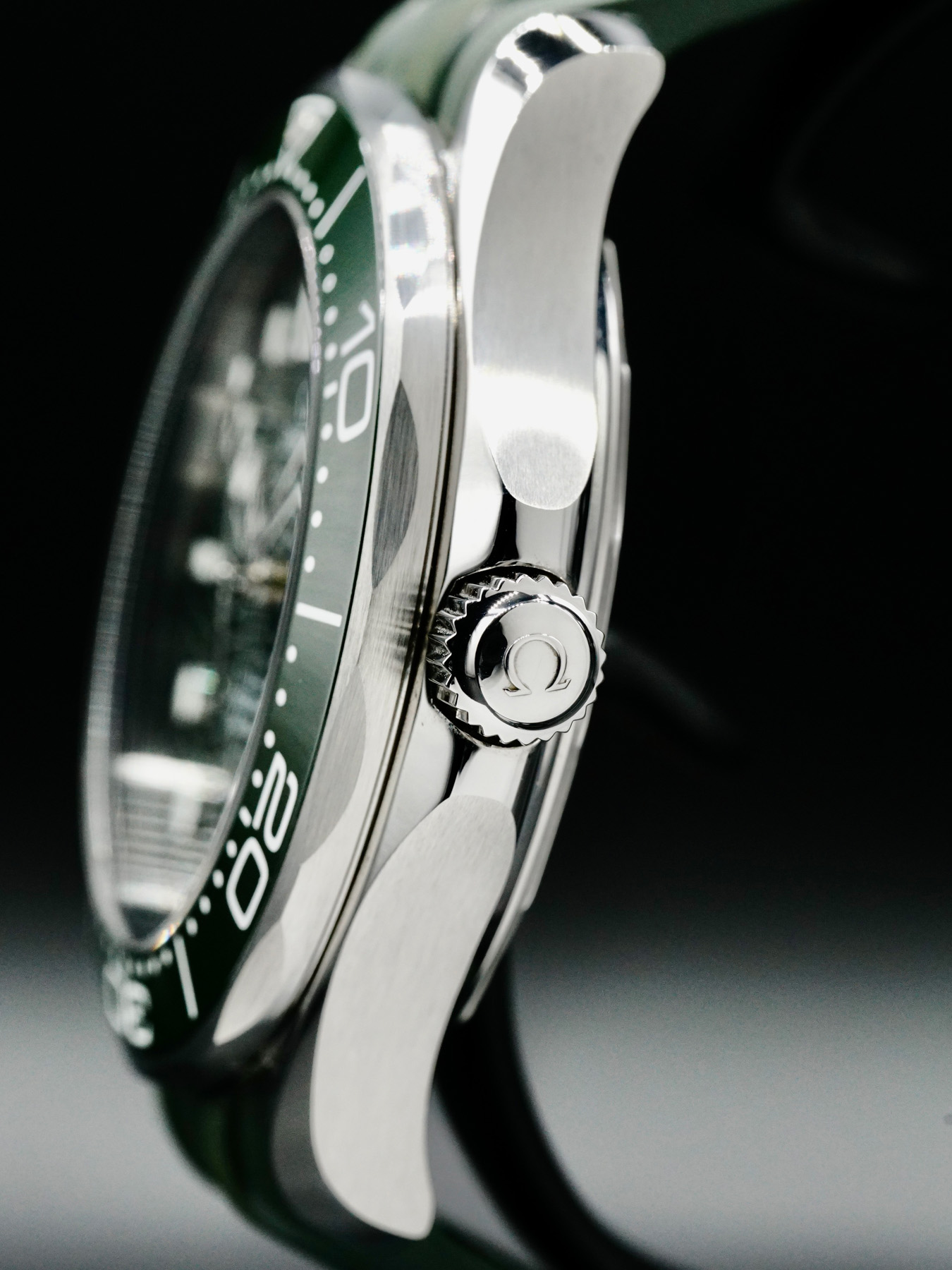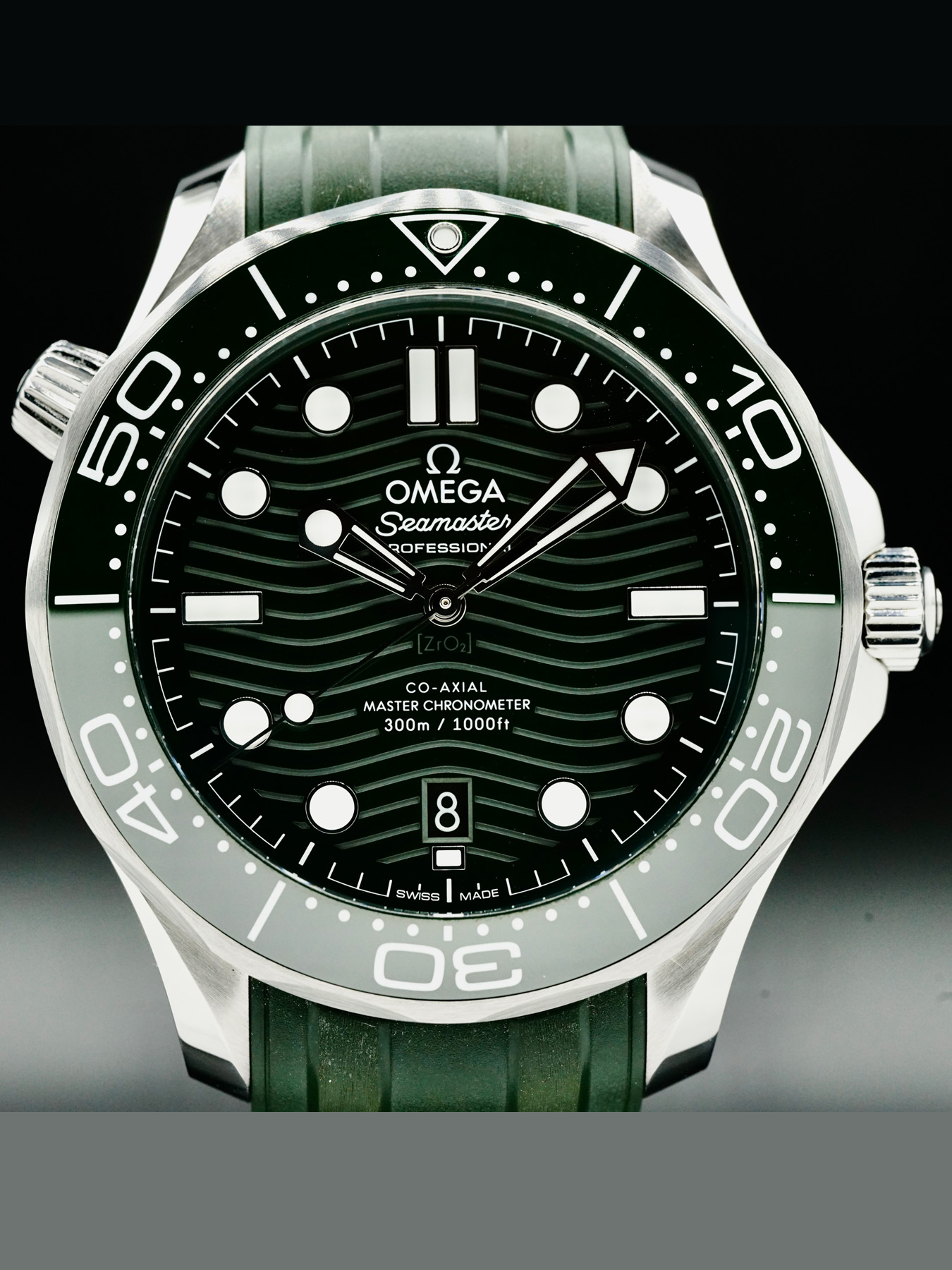 This Omega Seamaster Diver 300M Green Dial 210.30.42.20.10.001 is in GOOD condition. This watch includes its original box, instruction manual, and warranty card not dated. Extra stainless steel bracelet & links. This watch has been fully authenticated and certified by Exquisite Timepieces.