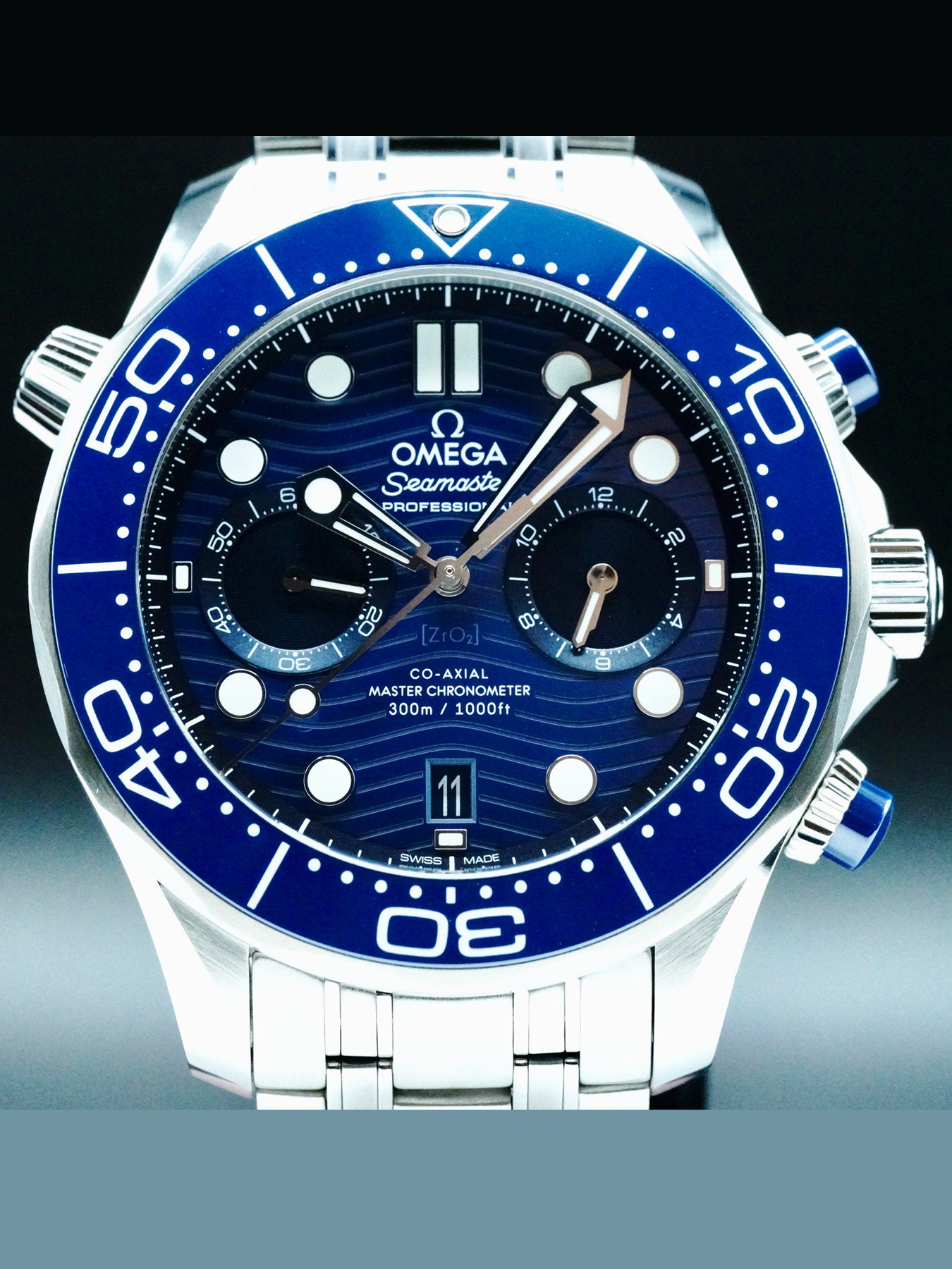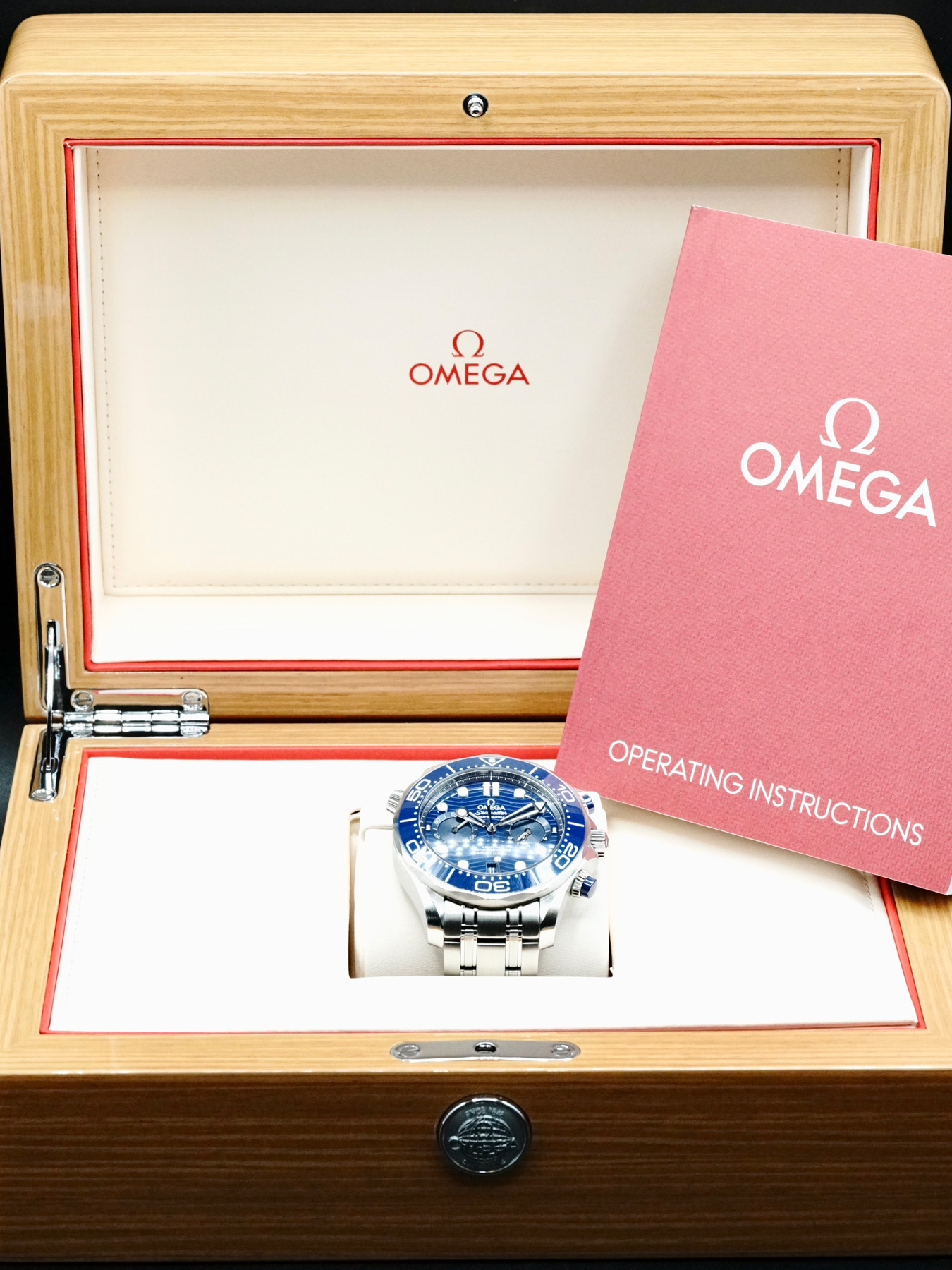 This Omega 210.30.44.51.03.001 Seamaster Diver 300m Master Chronometer Chronograph is in GREAT condition. It has box, papers, and instructions, but no warranty card. This watch has been fully authenticated and certified by Exquisite Timepieces.