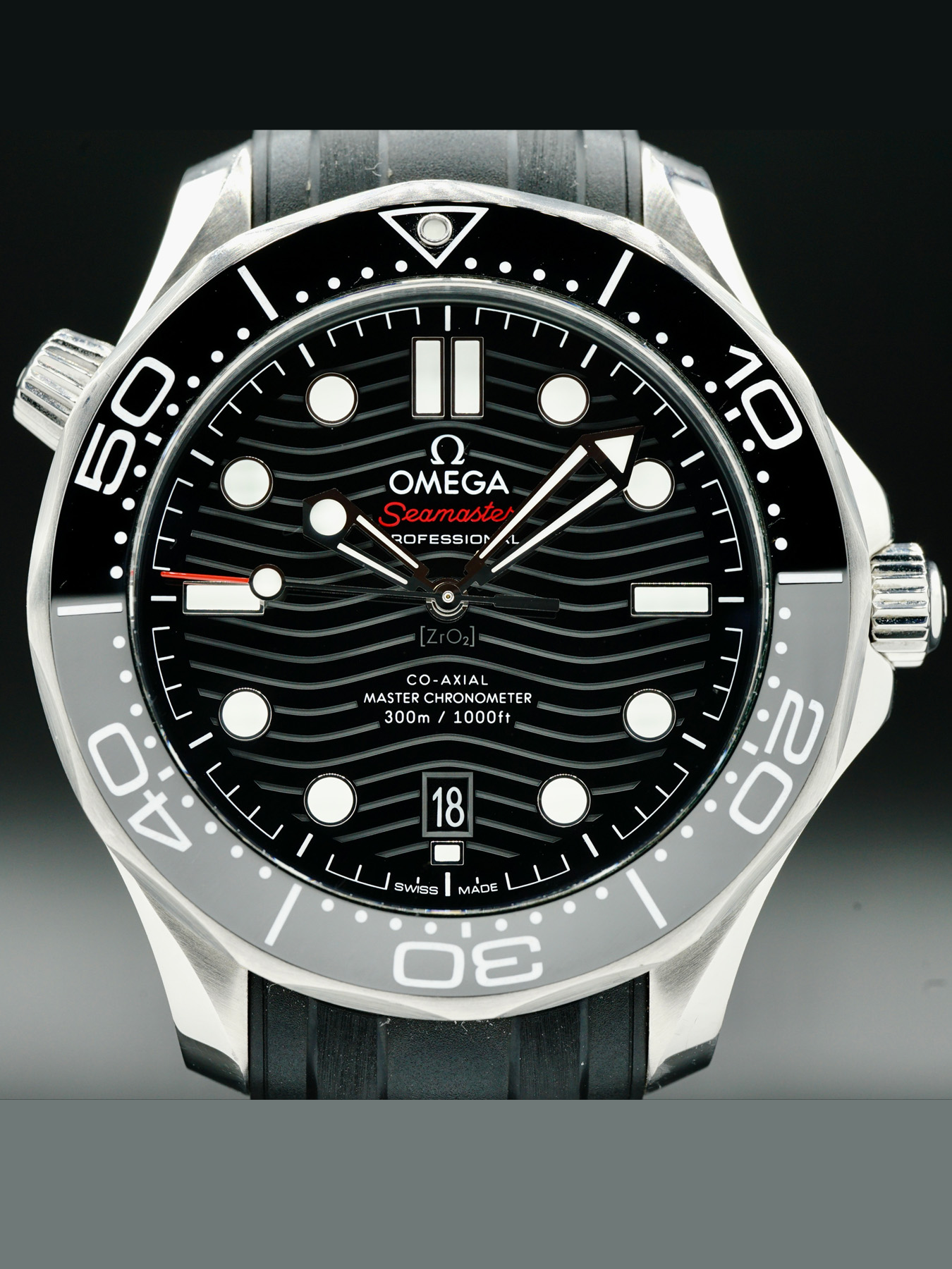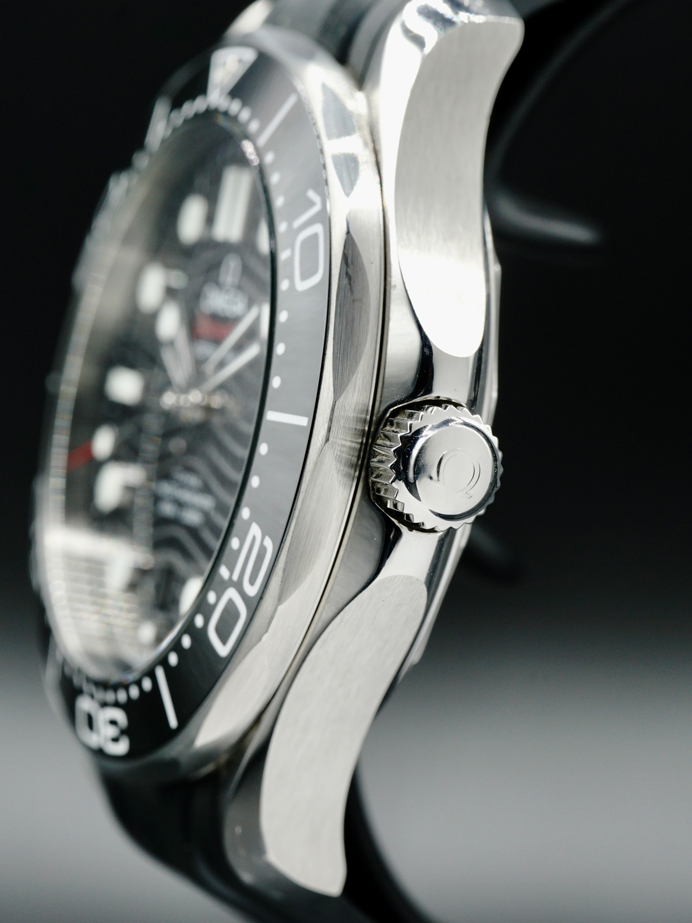 This Omega Seamaster Diver 300M features a 42mm stainless steel case & black ceramic bezel with a transparent case back on a black rubber strap. This watch also sports a black dial with luminous rhodium-plated skeleton hands and dot dial markers covered by scratch resistant sapphire crystal.