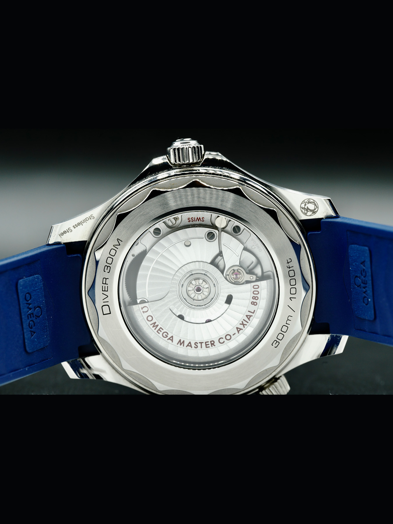 This watch features a 42 mm stainless steel case on rubber strap. This watch also sports a blue dial. Powered by a mechanical automatic movement. Water resistance up to 300 meters.