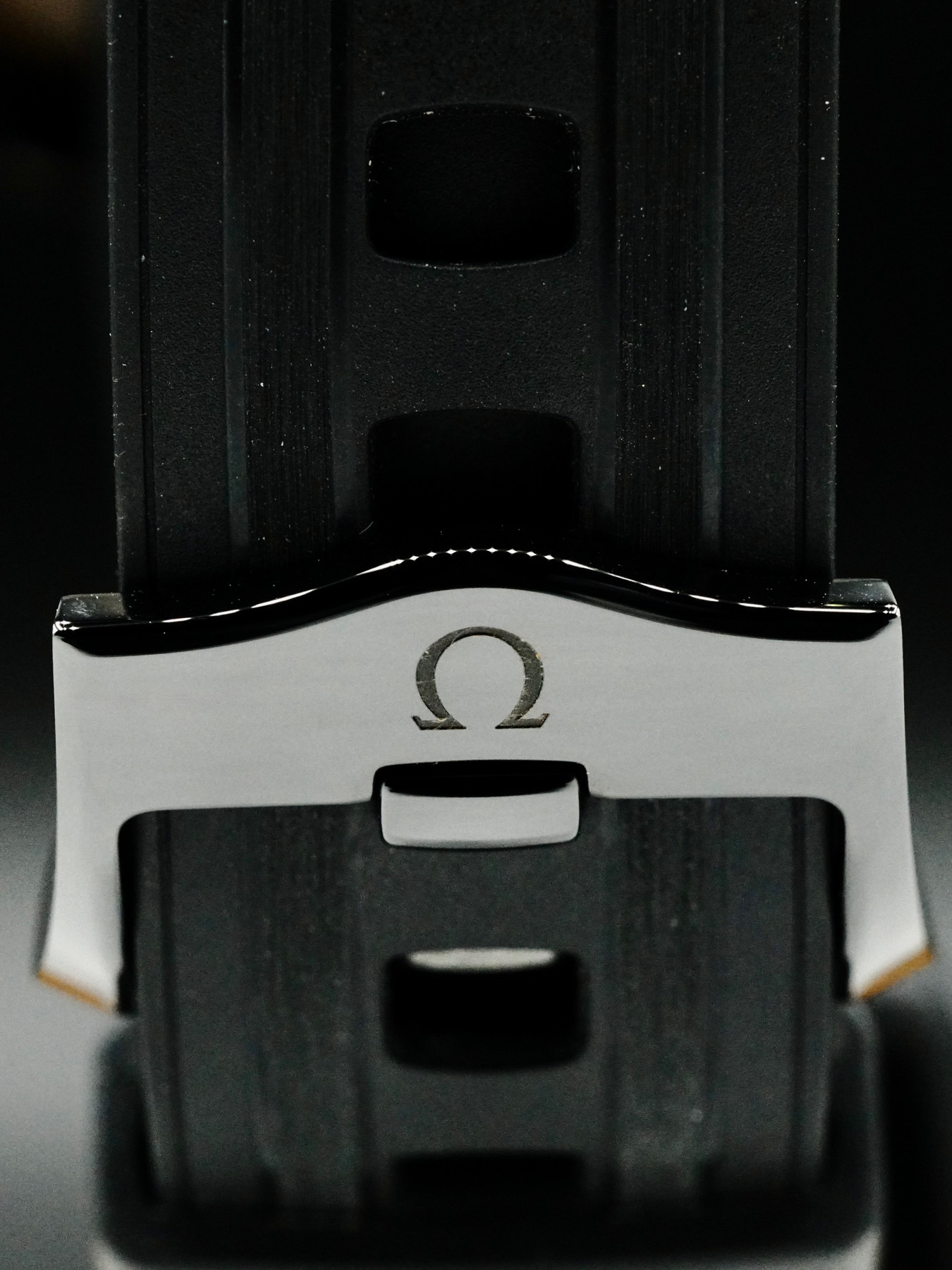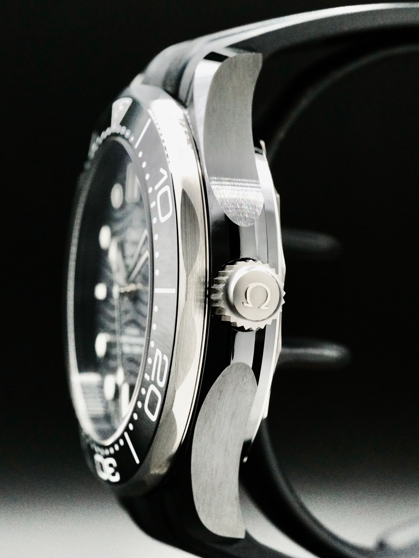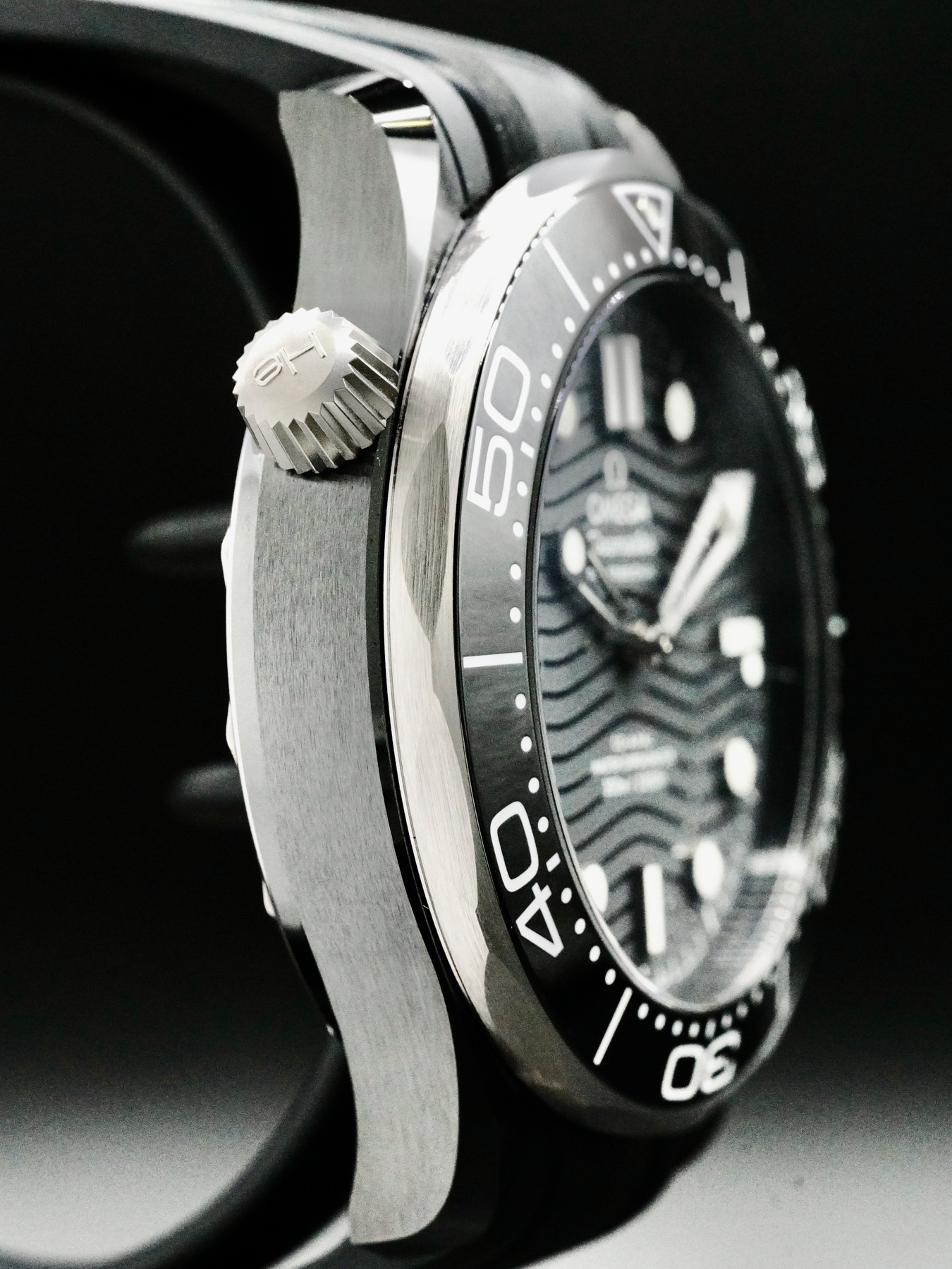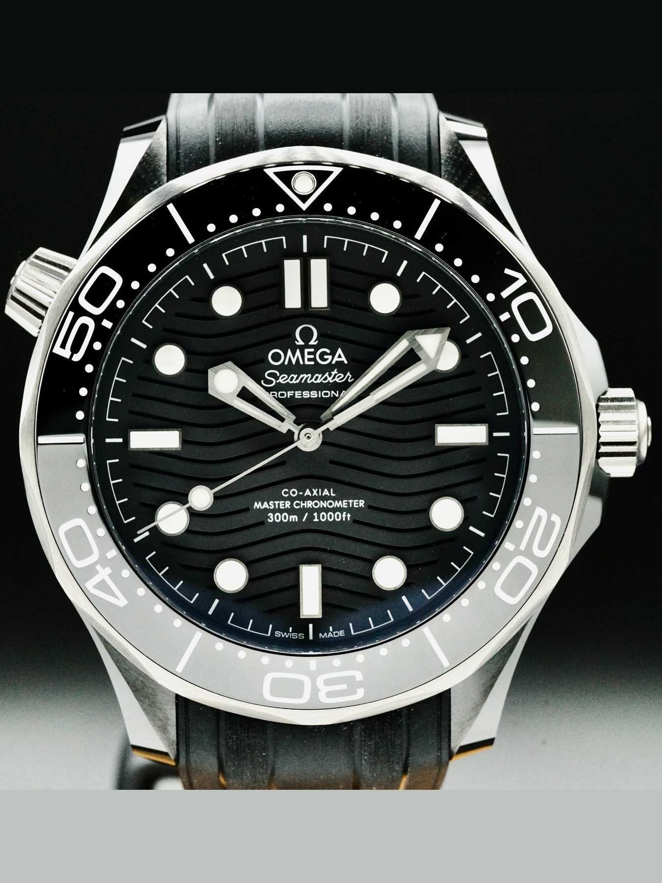 This Omega Seamaster Diver 300M features a 43.5mm black ceramic case with a display case back on a black rubber strap. This watch also sports a brushed black ceramic dial with luminous hands and index dial markers covered by scratch resistant sapphire crystal.