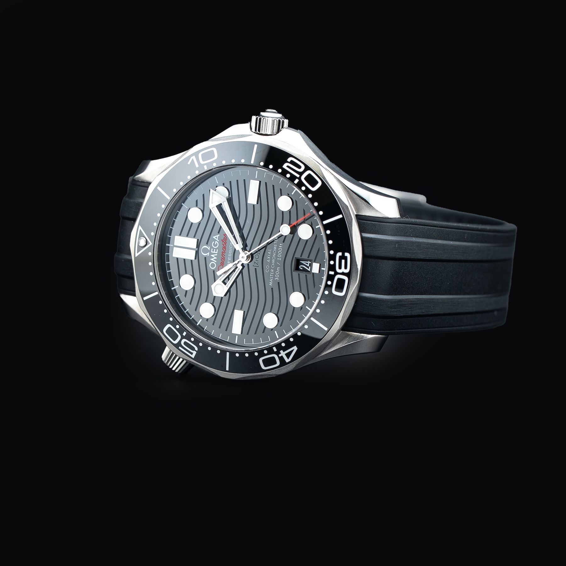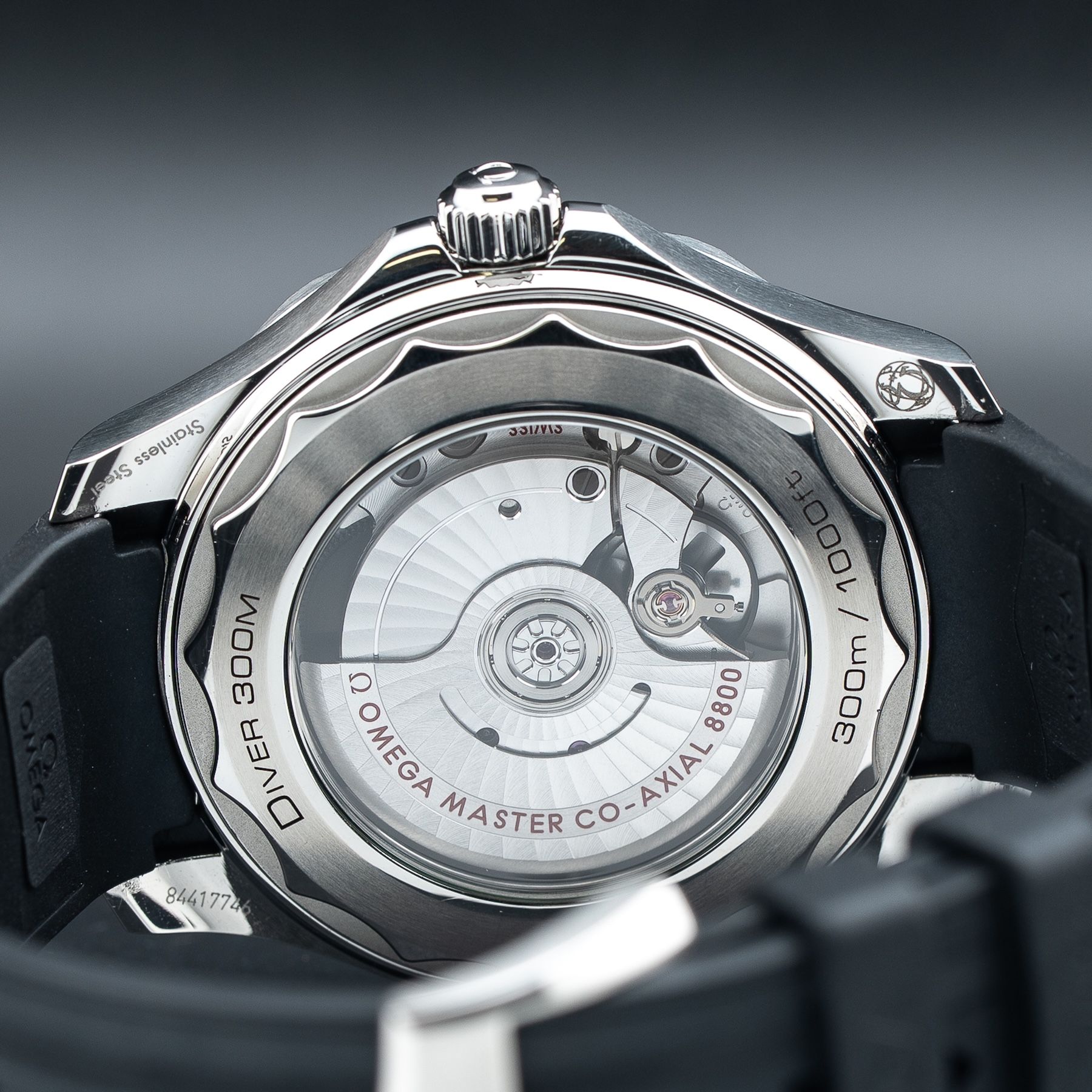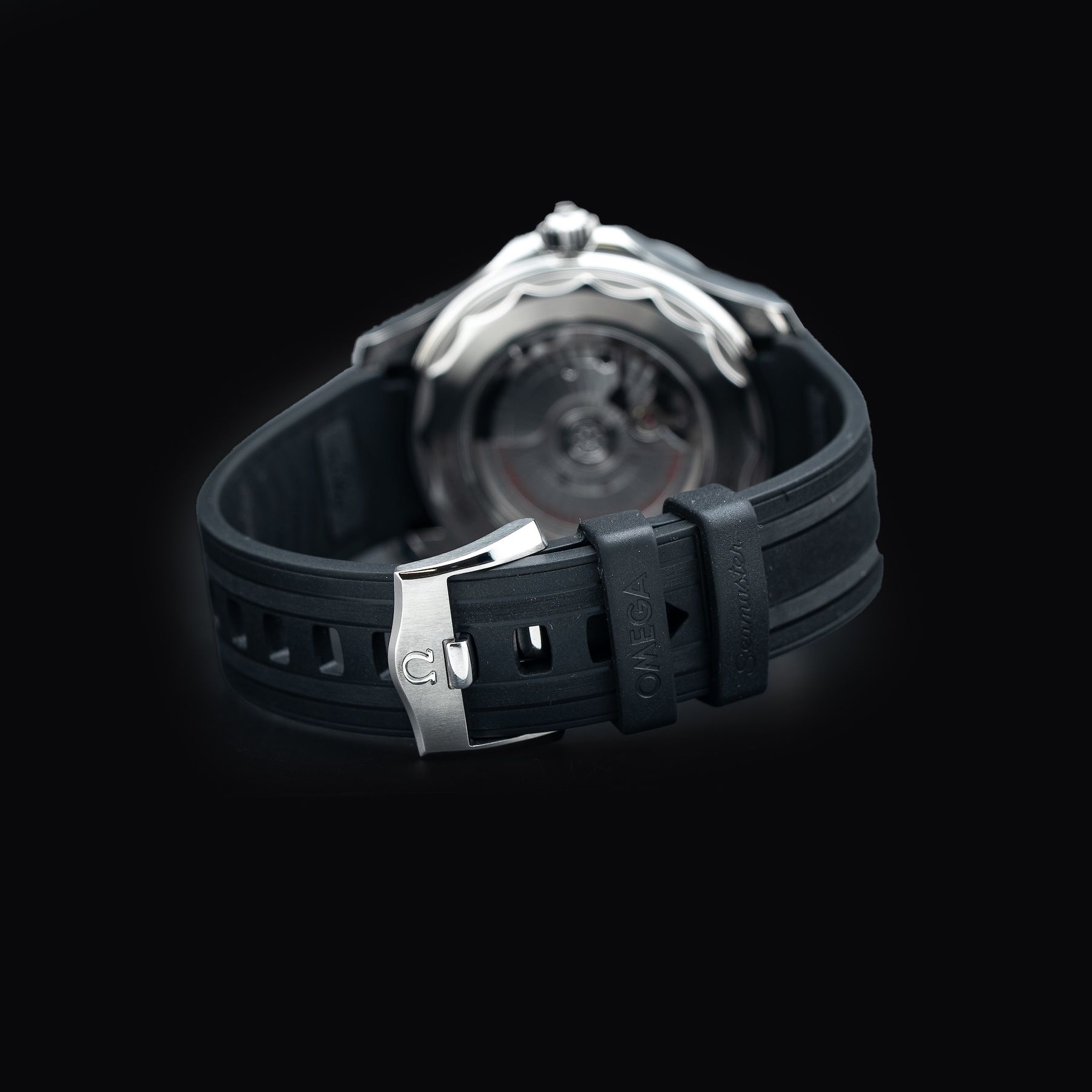 This watch features a 42mm stainless steel case on rubber strap. This watch also sports a black dial. Powered by an automatic movement. Water resistance up to 300 meters.