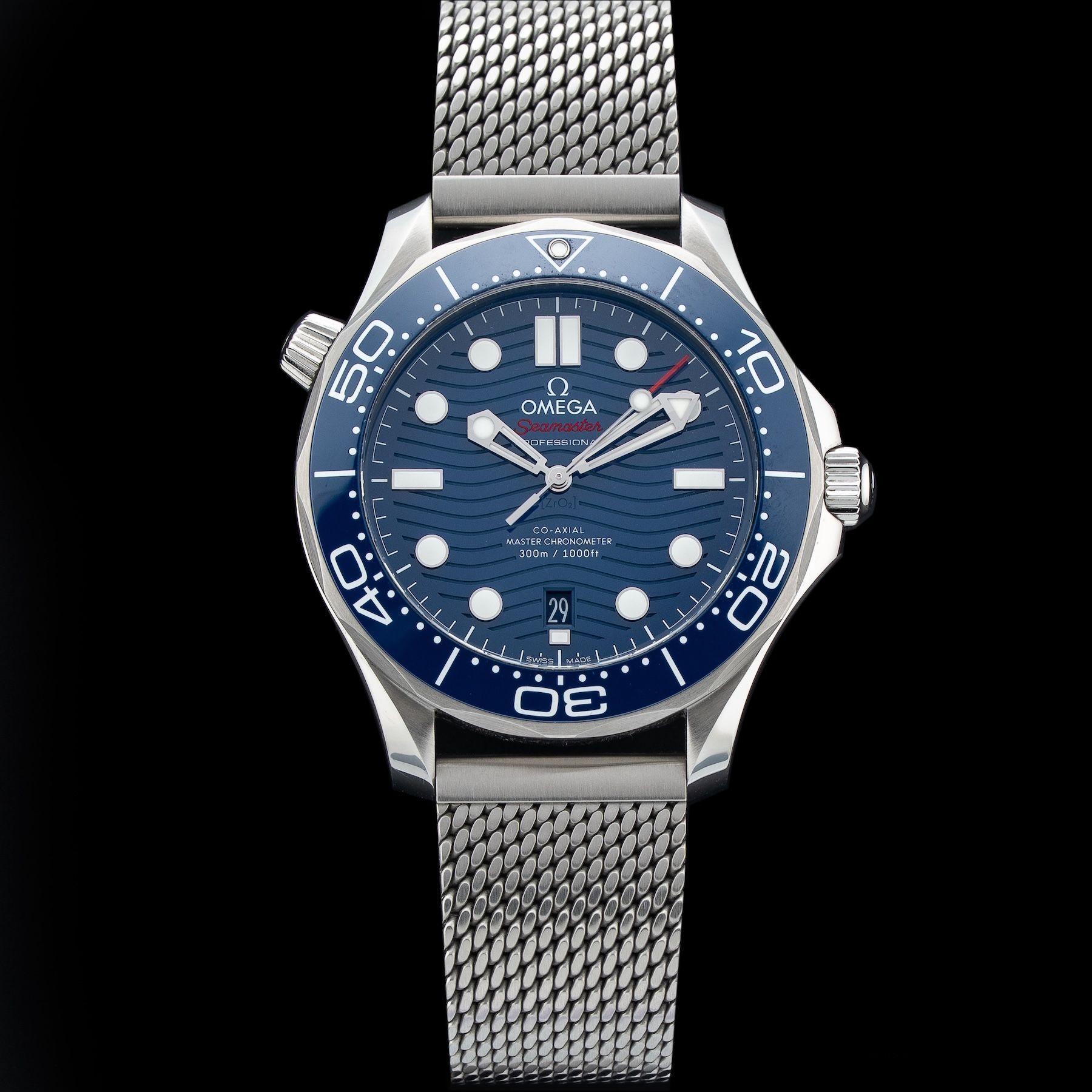 This watch features a 42 mm stainless steel case on rubber strap. This watch also sports a blue dial. Powered by a mechanical automatic movement. Water resistance up to 300 meters.