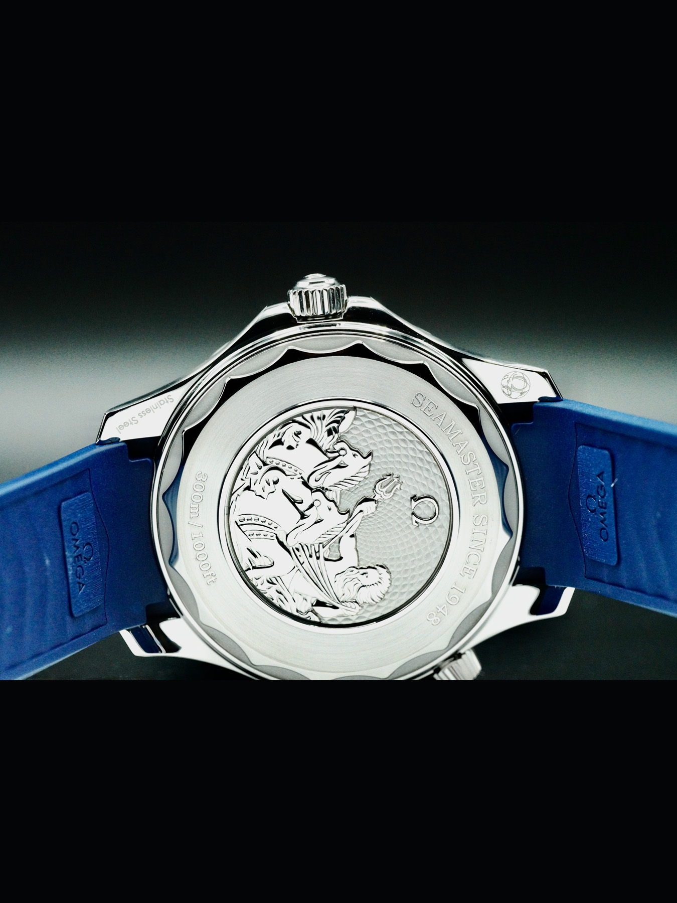 This Omega Seamaster Diver 300M Summer Blue features a 42mm stainless steel case with a solid case back on a blue rubber strap. This watch also sports a blue dial with luminous hands and dot dial markers covered by scratch resistant sapphire crystal.