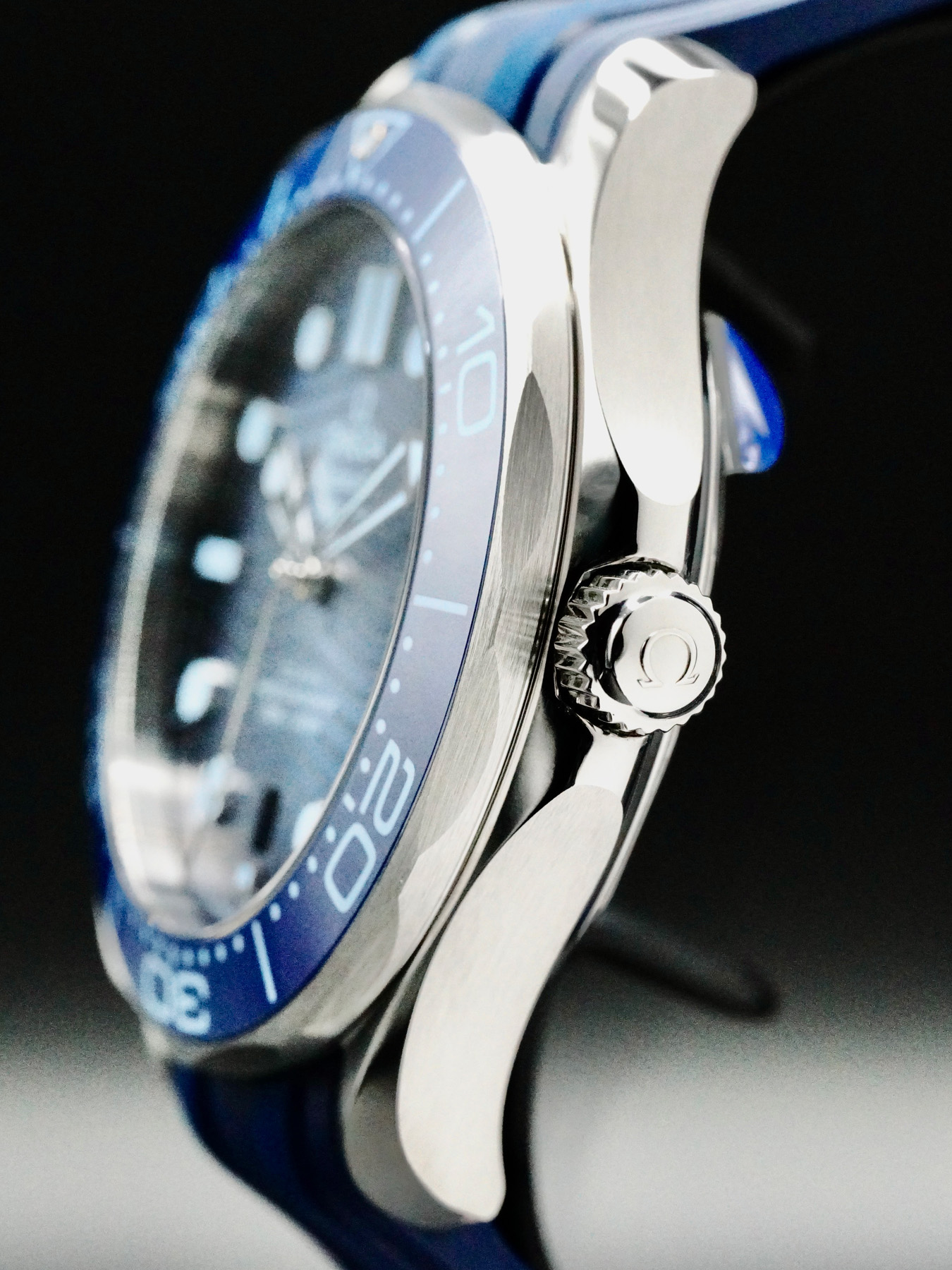 This Omega Seamaster Diver 300M Summer Blue on Strap 210.32.42.20.03.002 is in EXCELLENT condition. This watch includes its original box, instruction manual, and warranty card dated for August 2024. This watch has been fully authenticated and certified by Exquisite Timepieces.