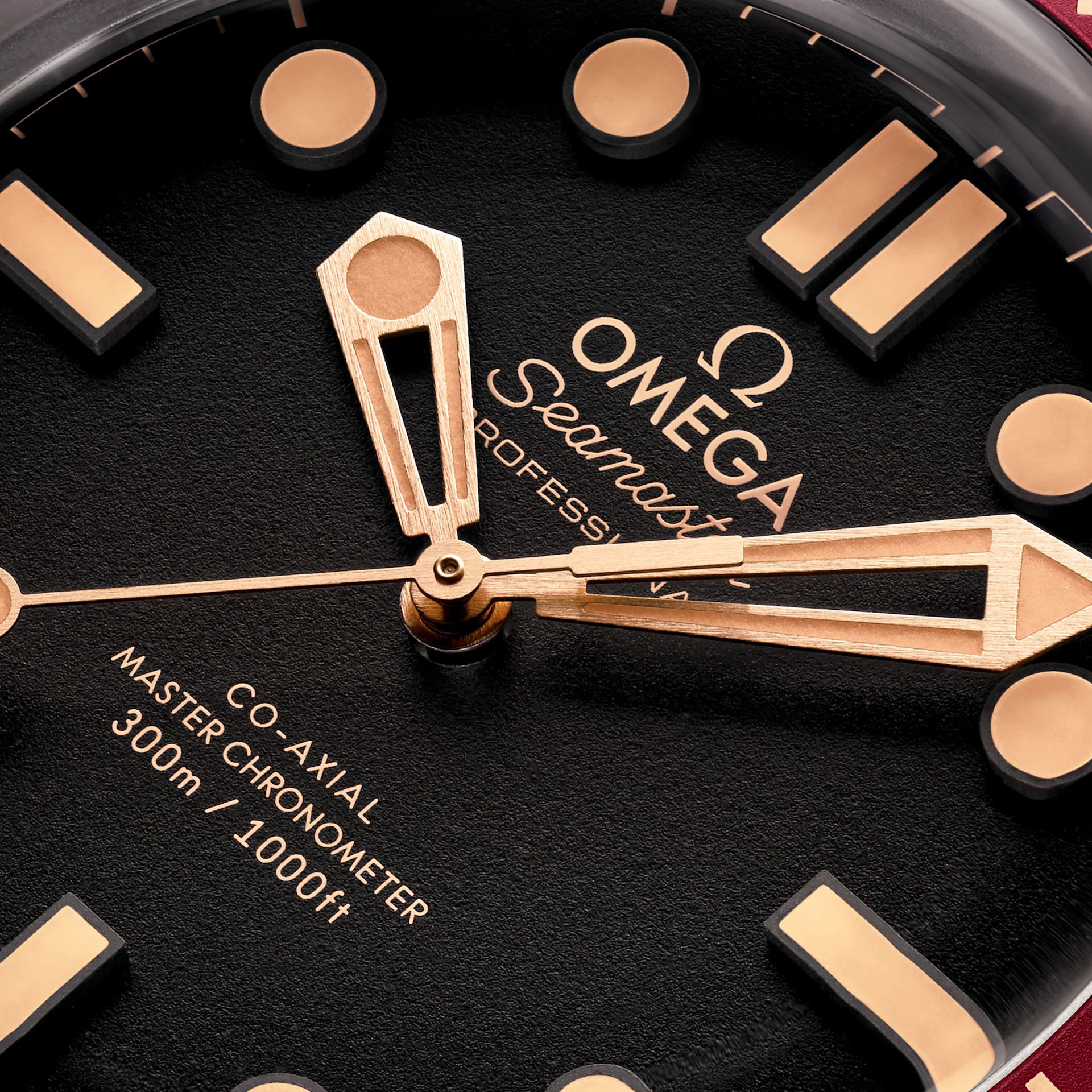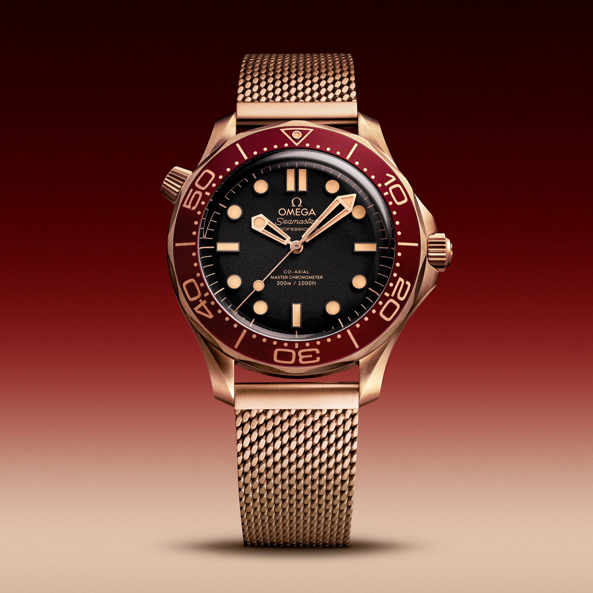 This 42 mm model is crafted in OMEGA’s exclusive Bronze Gold and includes a burgundy oxalic anodized aluminium bezel ring with a diving scale in vintage Super-LumiNova.