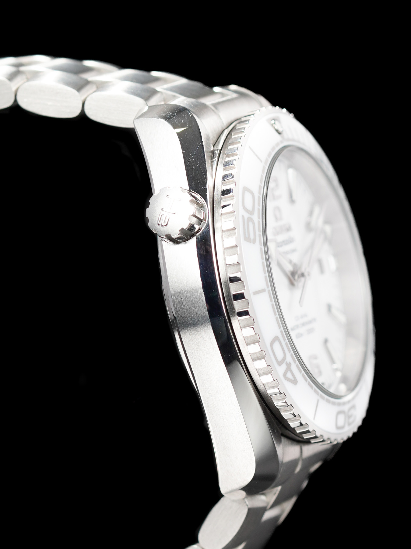 This watch features a 39.5mm stainless steel case on stainless steel bracelet. This watch also sports a white dial. Powered by a mechanical automatic movement. Water resistance up to 600 meters.