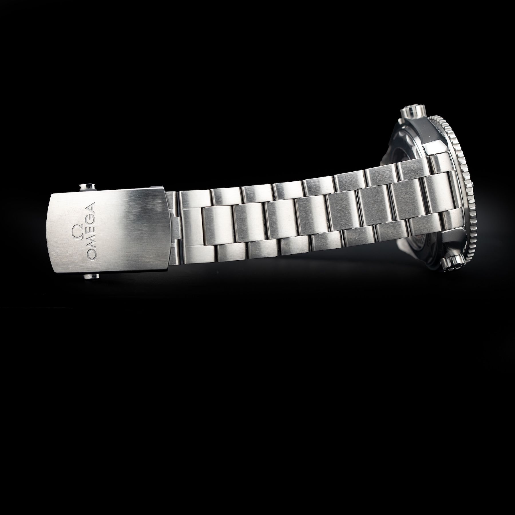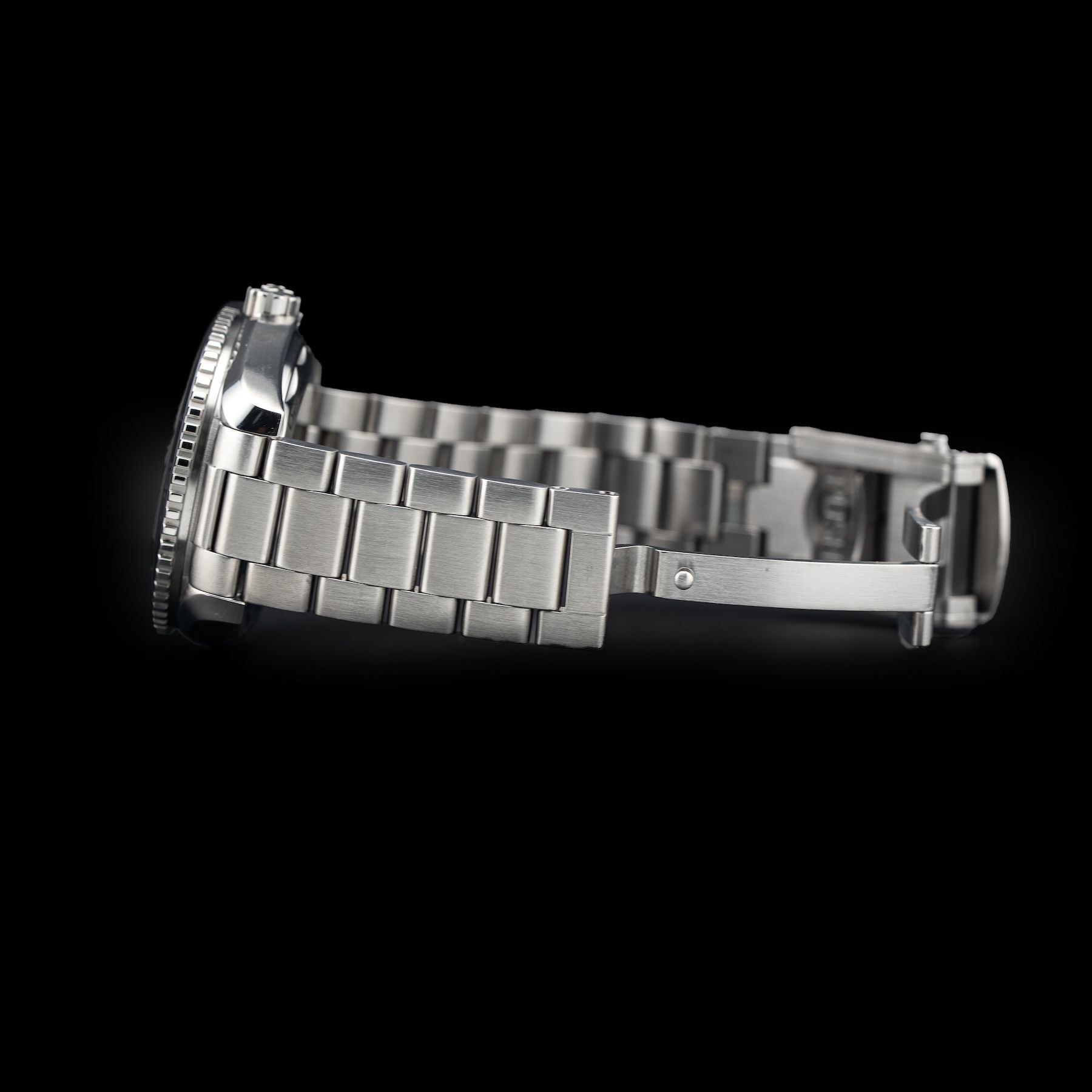 This watch features a 39.5mm stainless steel case on stainless steel bracelet. This watch also sports a black dial. Powered by a mechanical automatic movement. Water resistance up to 600 meters.