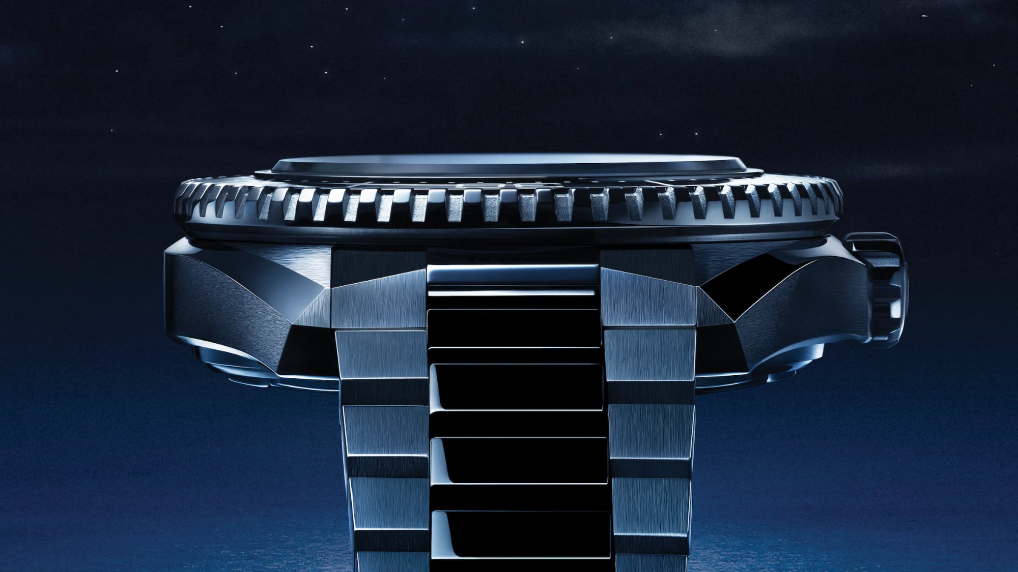 This 42 mm model is crafted with a case in polished-brushed stainless steel. It features a polished black ceramic bezel ring with a diving scale in white enamel, while the inner ring is made from polished grade 5 titanium.