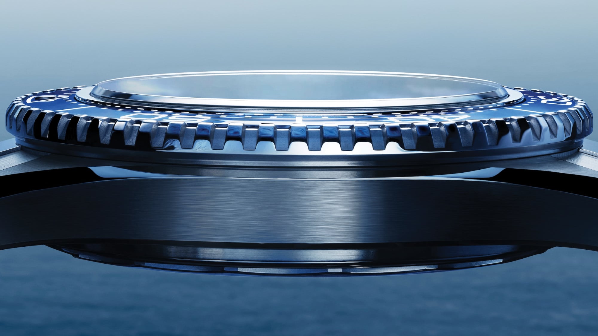 This 42 mm model is crafted with a case in polished-brushed stainless steel. It features a polished blue ceramic bezel ring with a diving scale in white enamel, while the inner ring is made from polished grade 5 titanium.