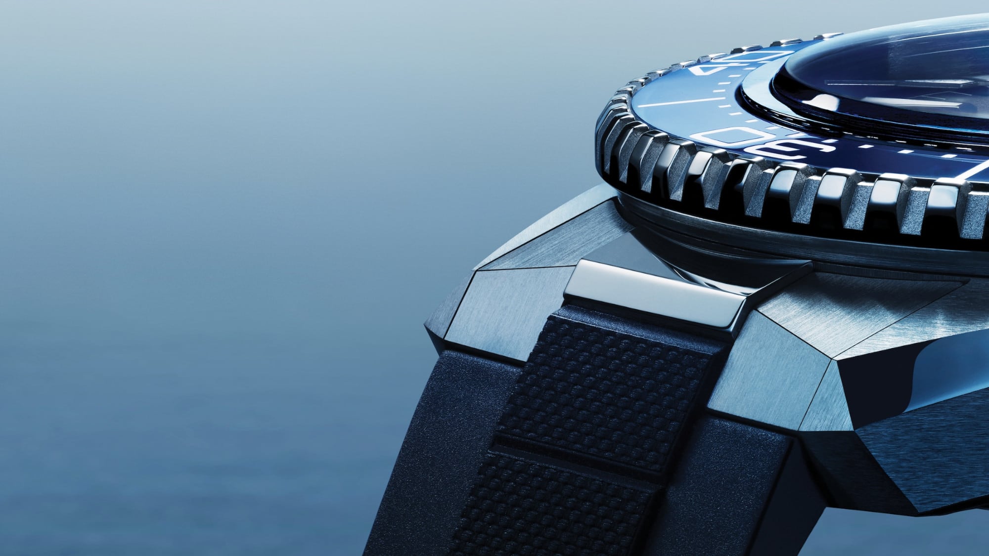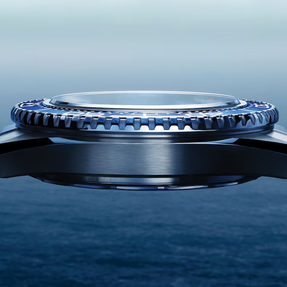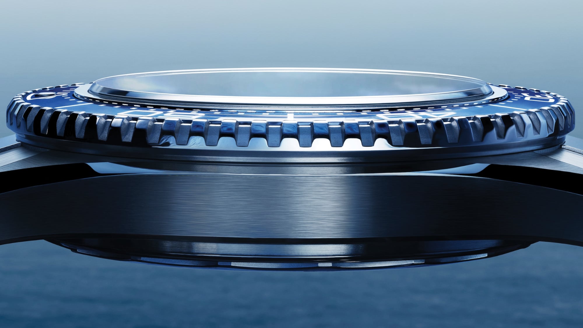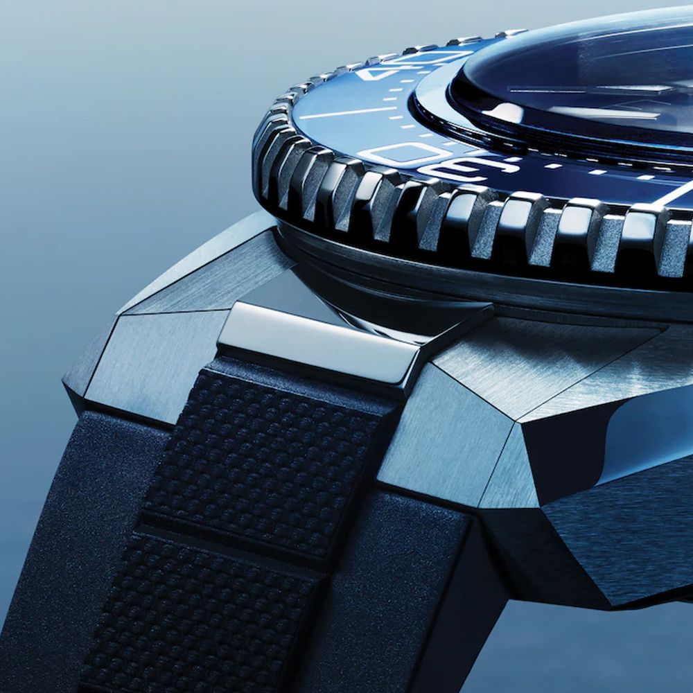 This 42 mm model is crafted with a case in polished-brushed stainless steel. It features a polished blue ceramic bezel ring with a diving scale in white enamel, while the inner ring is made from polished grade 5 titanium.