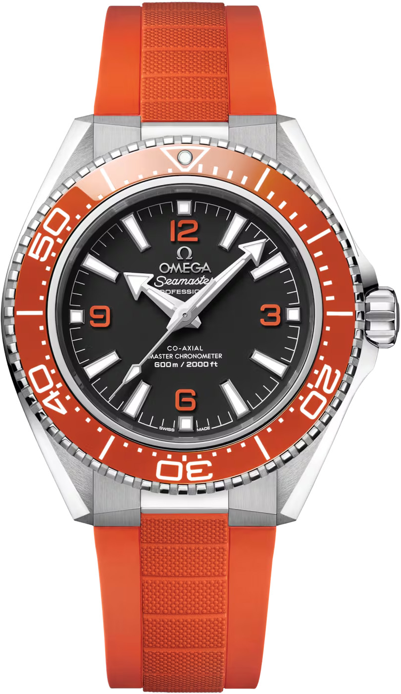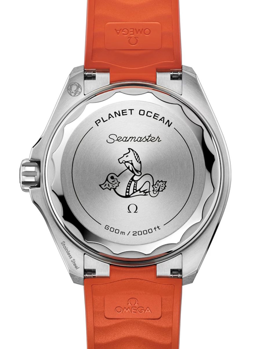 Powered by the Co-Axial Master Chronometer Calibre 8912, this Seamaster Planet Ocean is worn on an orange rubber strap with a stainless steel link to the case and a foldover clasp. On the reverse side of the watch, the screw-in caseback is made from polished-brushed grade 5 titanium, and displays OMEGA’s famous seahorse emblem.