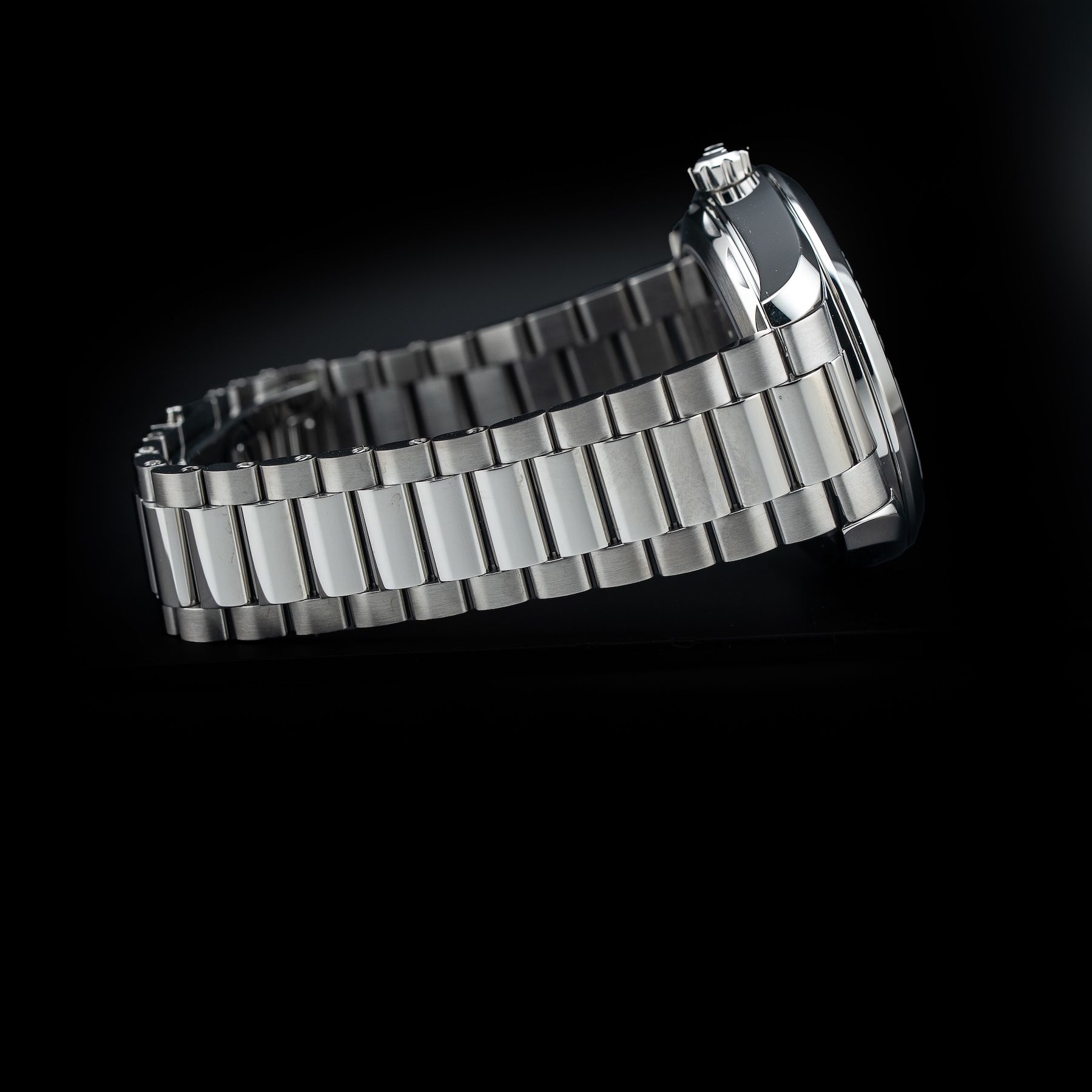 This watch features a 41mm stainless steel case on stainless steel bracele. This watch also sports a black dial. Powered by a self-winding movement. Water resistance up to 150 meters.