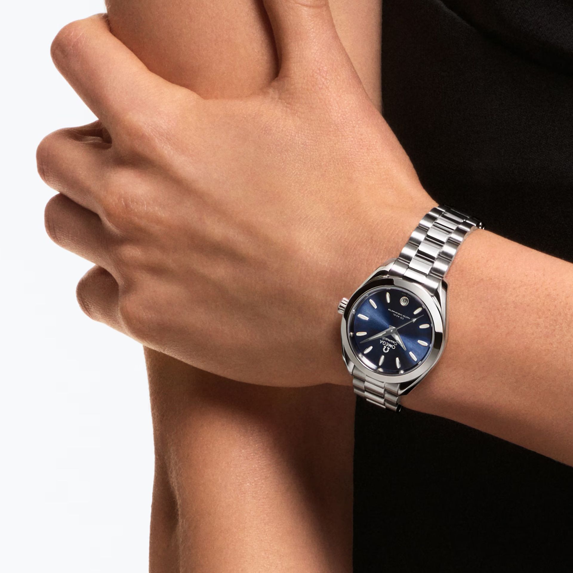 The watch is presented on an integrated stainless steel bracelet with beautifully rounded polished-brushed links, a foldover butterfly clasp, and OMEGA’s easy comfort-adjustment system.