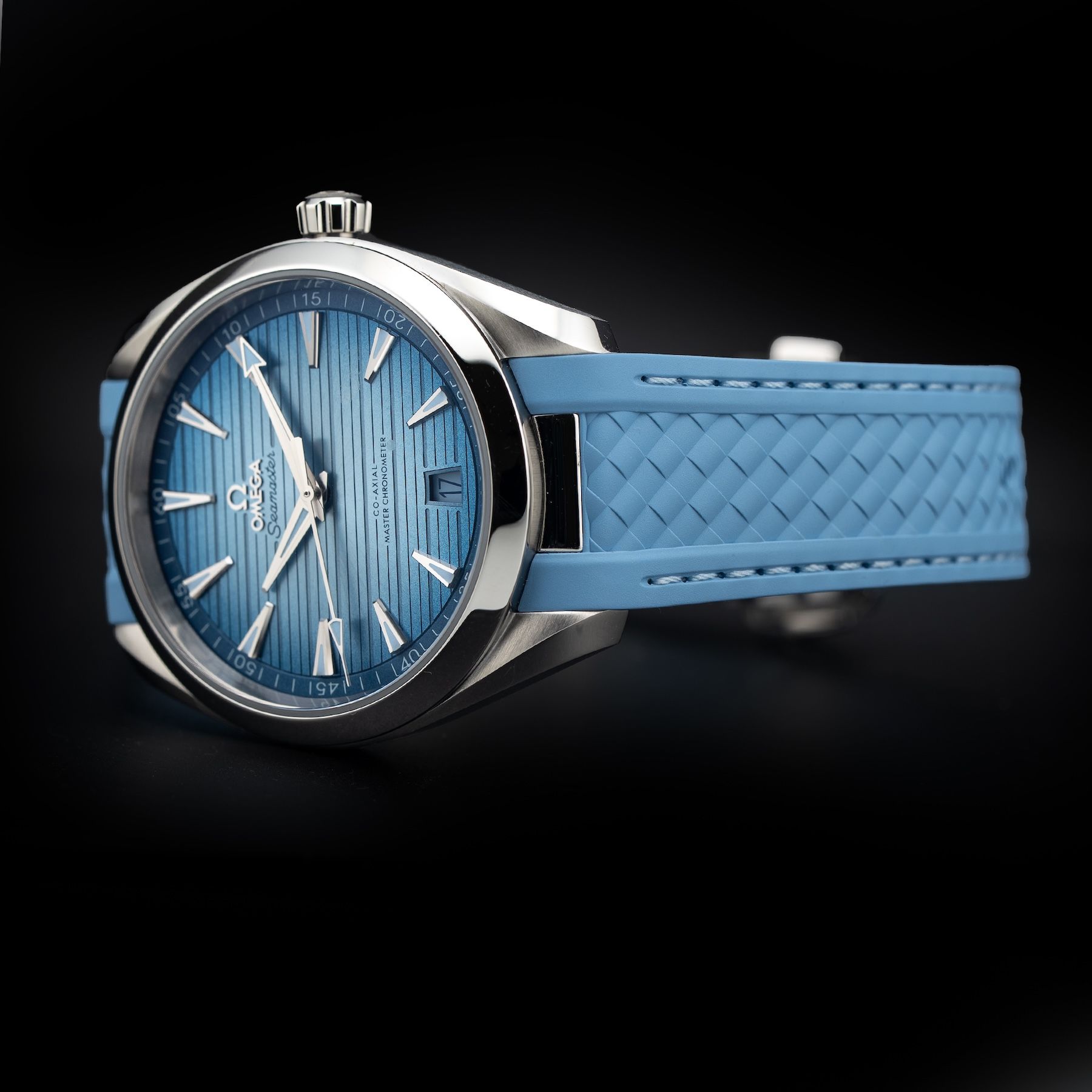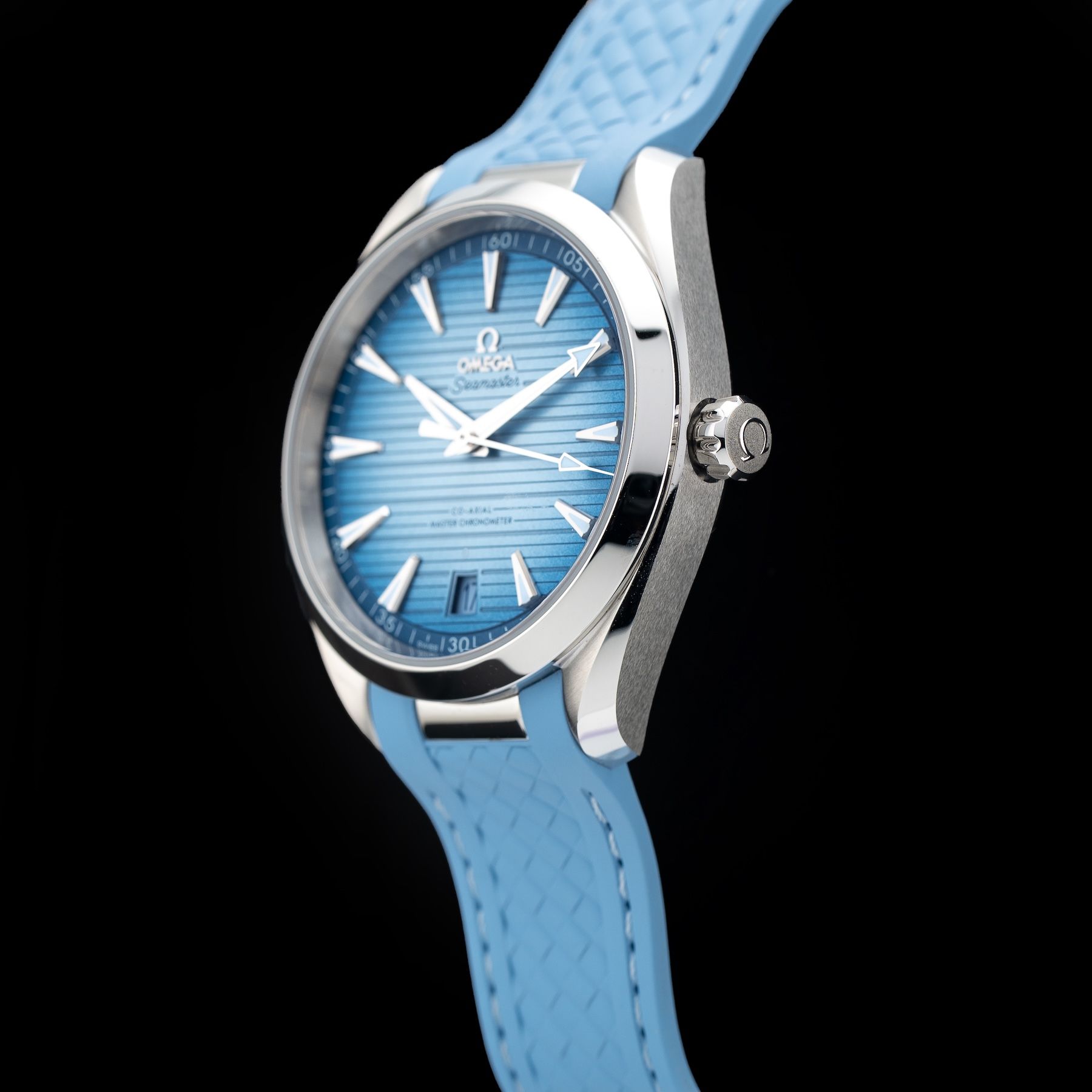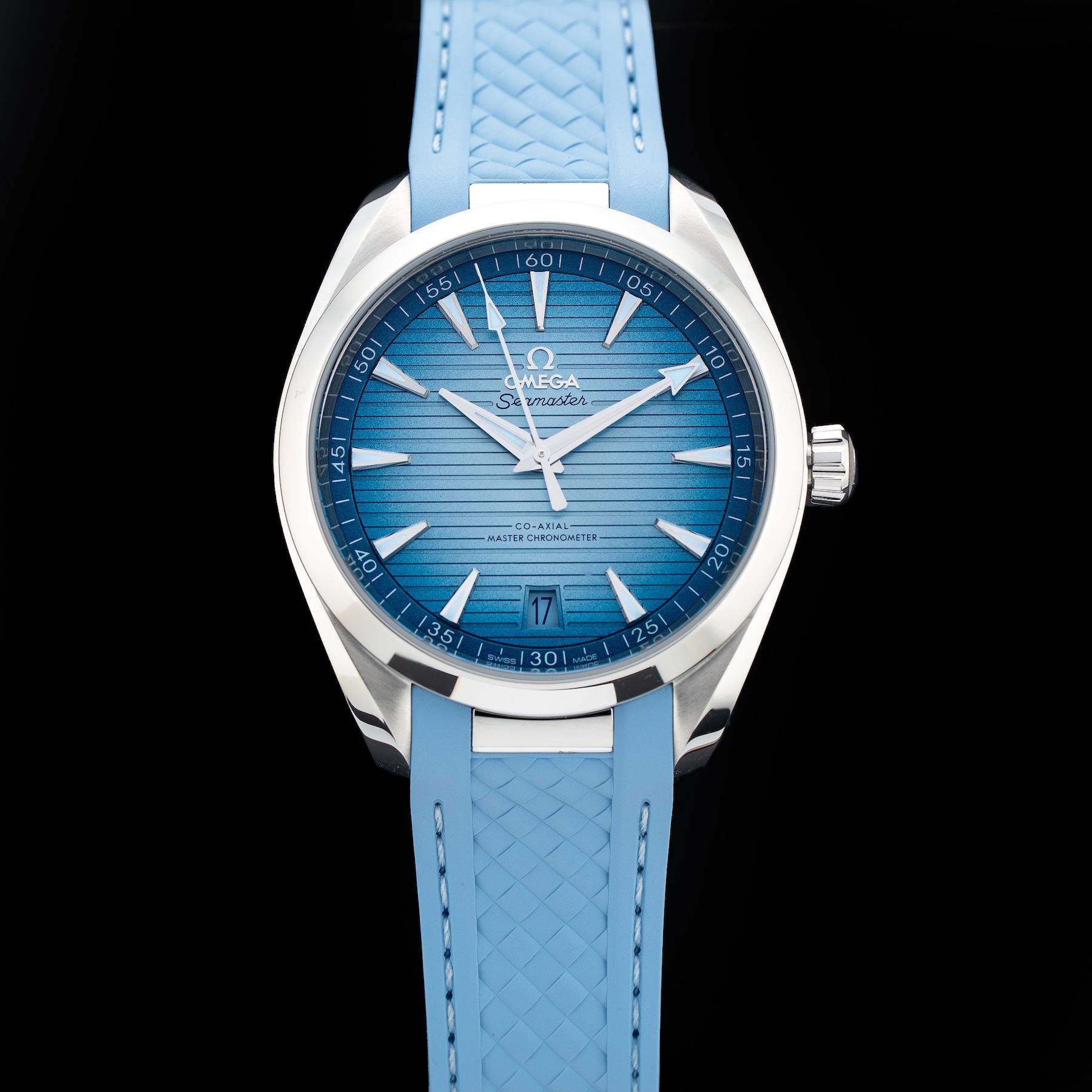 This watch features a 41mm stainless steel case on rubber strap. This watch also sports a summer blue dial. Powered by a mechanical automatic movement. Water resistance up to 150 meters.