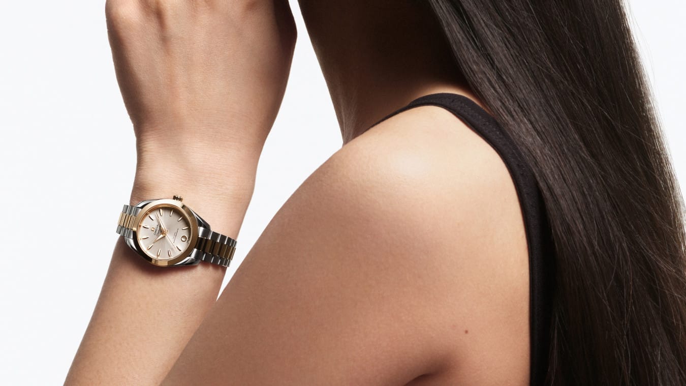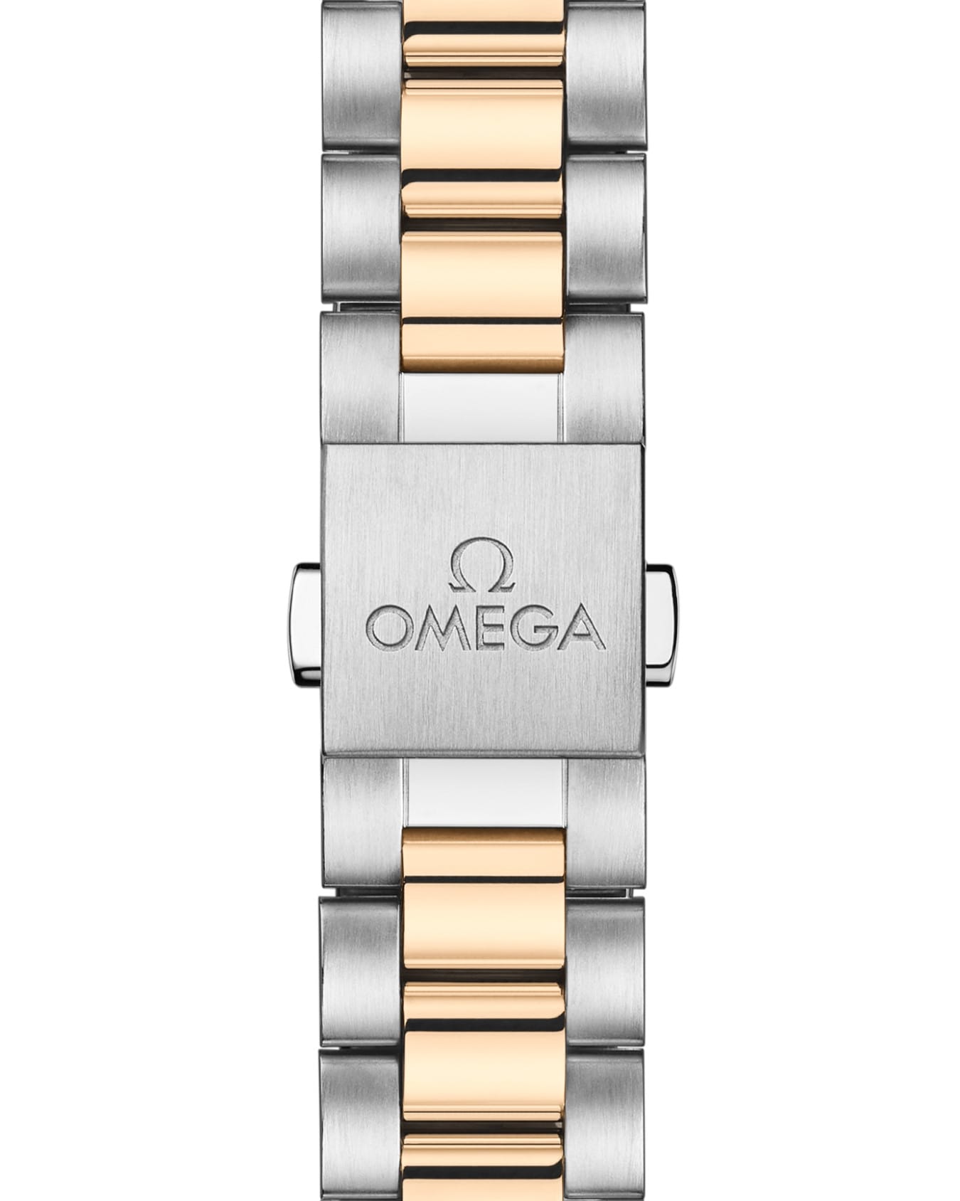 The watch is presented on an integrated stainless steel and 18K Moonshine™ Gold bracelet with beautifully rounded polished-brushed links, a foldover butterfly clasp, and OMEGA’s easy comfort-adjustment system.