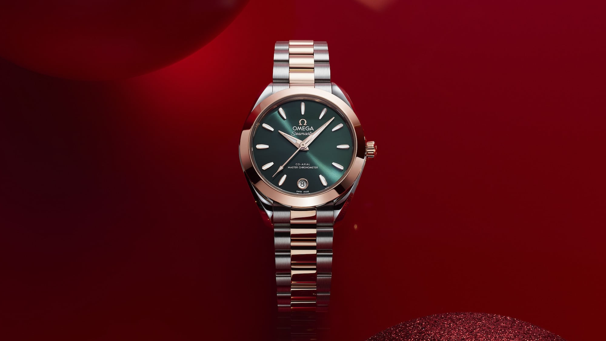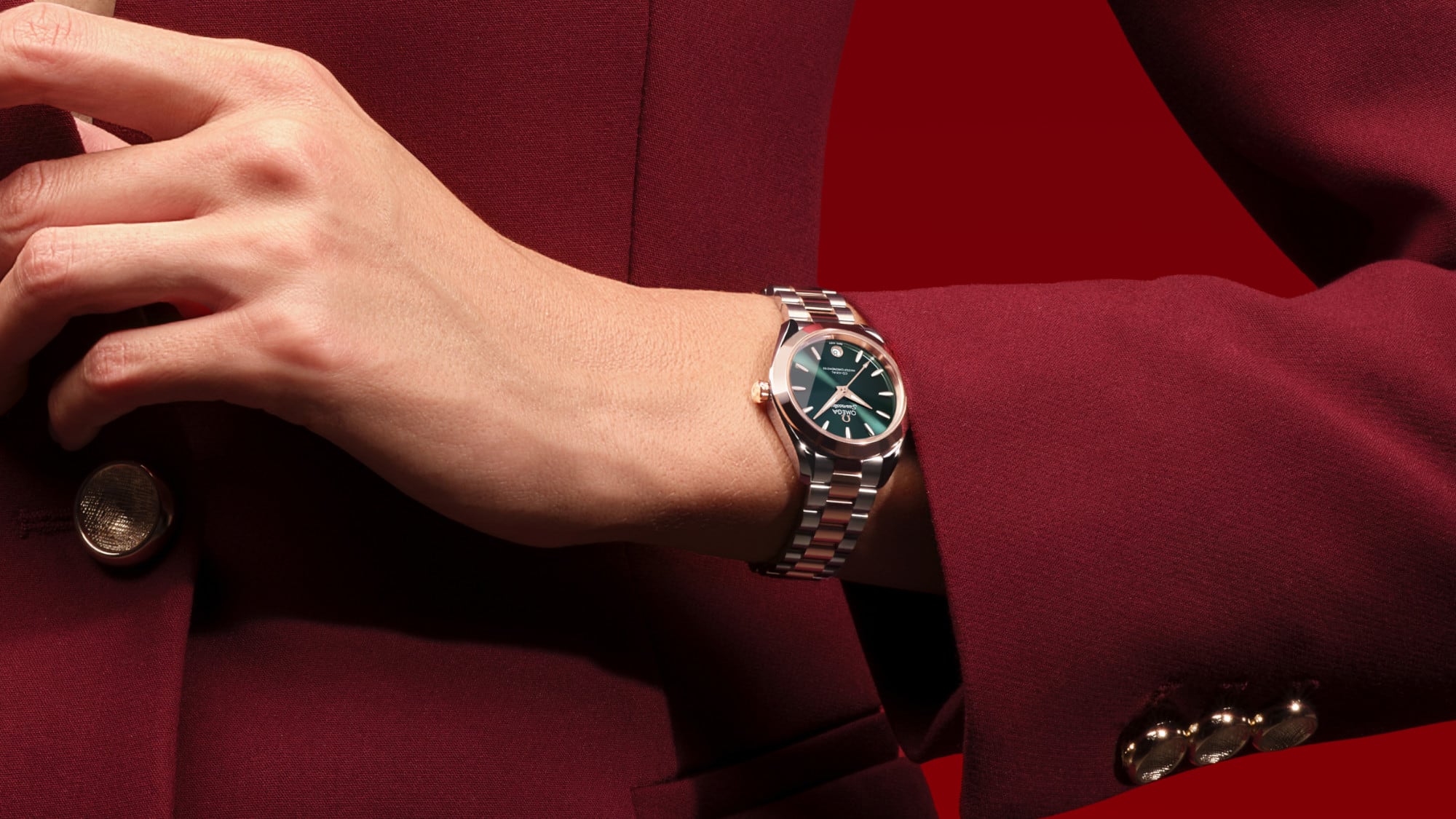 The pine green dial is sun-brushed and coloured with tinted lacquer, with a circular date window at 6 o’clock. It is highlighted by 11 boat hull-shaped indexes and redesigned faceted hands, with the minute hand tapering to a delicate point. All the applied elements and hands are in 18K Sedna™ Gold, while the indexes and hands are also filled with white Super-LumiNova which emits a blue glow.